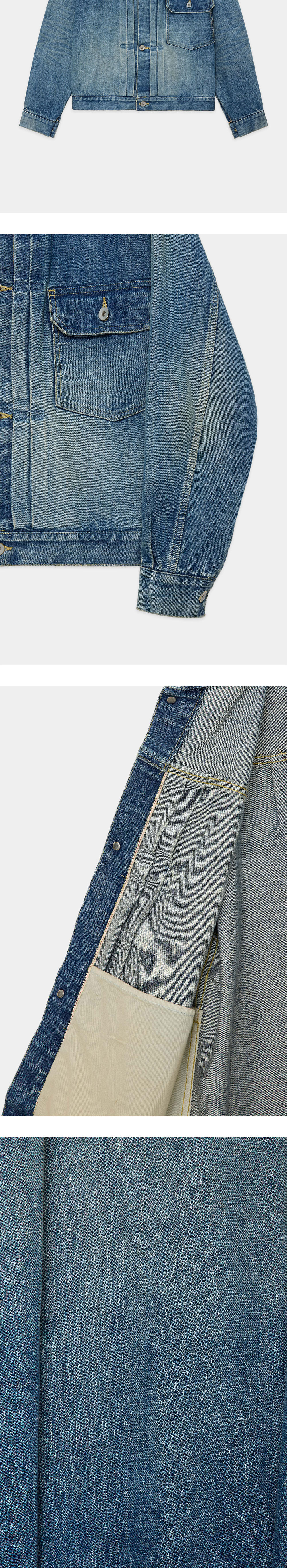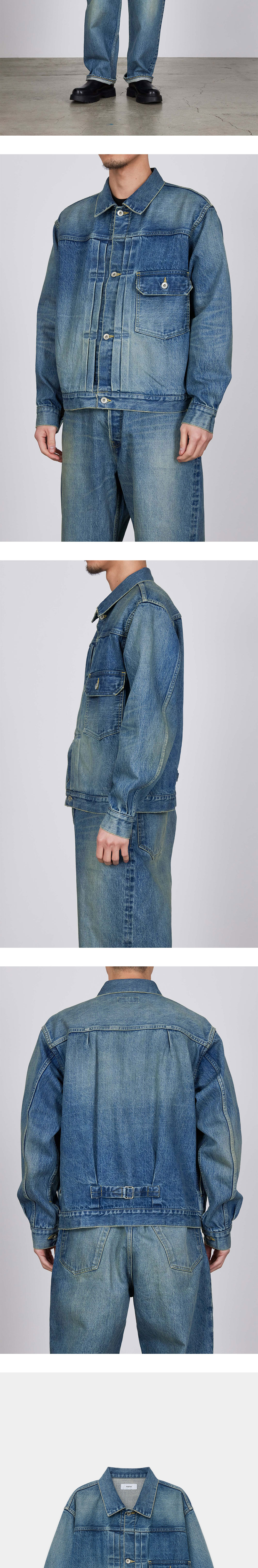 절제된 실루엣과 디테일로 시간이 지날수록 매력을 더하는 마카의 뉴 타입1 데님 자켓입니다. - 사계절 착용 가능한 13.5온스 데님 원단으로 제작 - 후면의 버클 디테일로 연출되는 플리츠