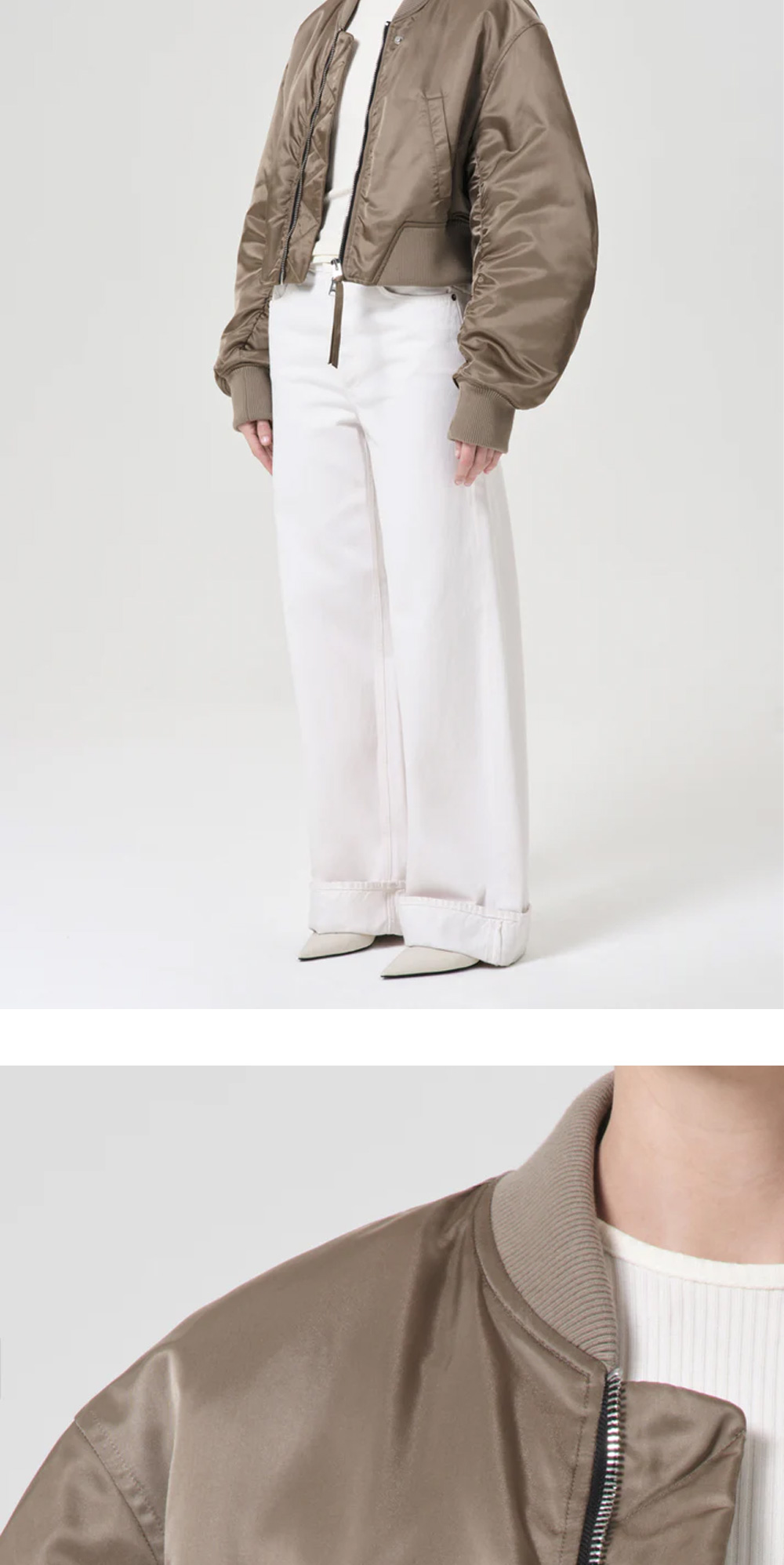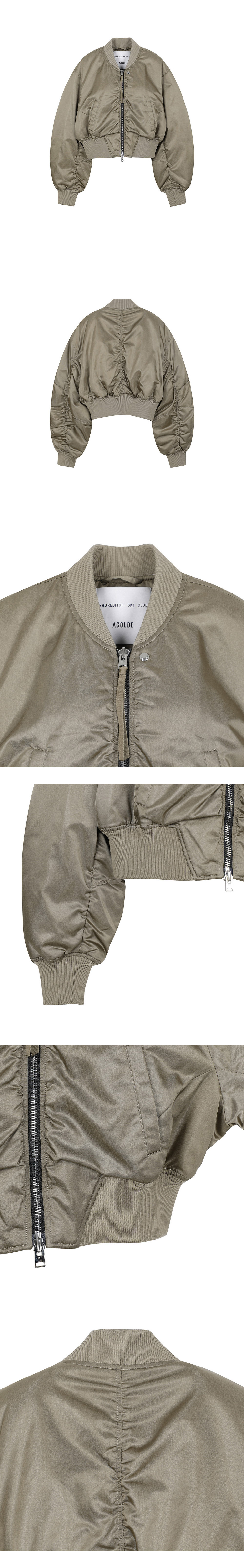 크롭 기장과 곡선의 소매 실루엣으로 우아한 느낌을 주는 에이골디의 봄버 자켓입니다. - 릴랙스 핏 - 드롭 숄더 디자인 - 두껍지 않은 내부 퀼팅 - 소매 및 후면 셔링 디테일 - 매우 부드러운 소재의 립