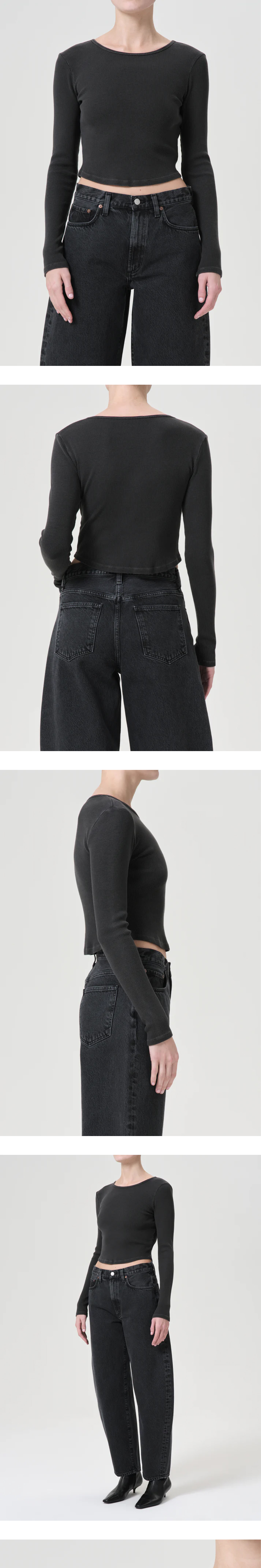 하이웨이스트 데님과 매치하기에 완벽한 에이골디의롱슬리브 티셔츠입니다. - 어떤 스타일에도 매칭 가능한 클래식한 디자인 - 핏한 디자인 - 곡선형의 크롭 밑단 - 지지력과 통기성이 뛰어난 라이트웨이트 코튼 립 원단