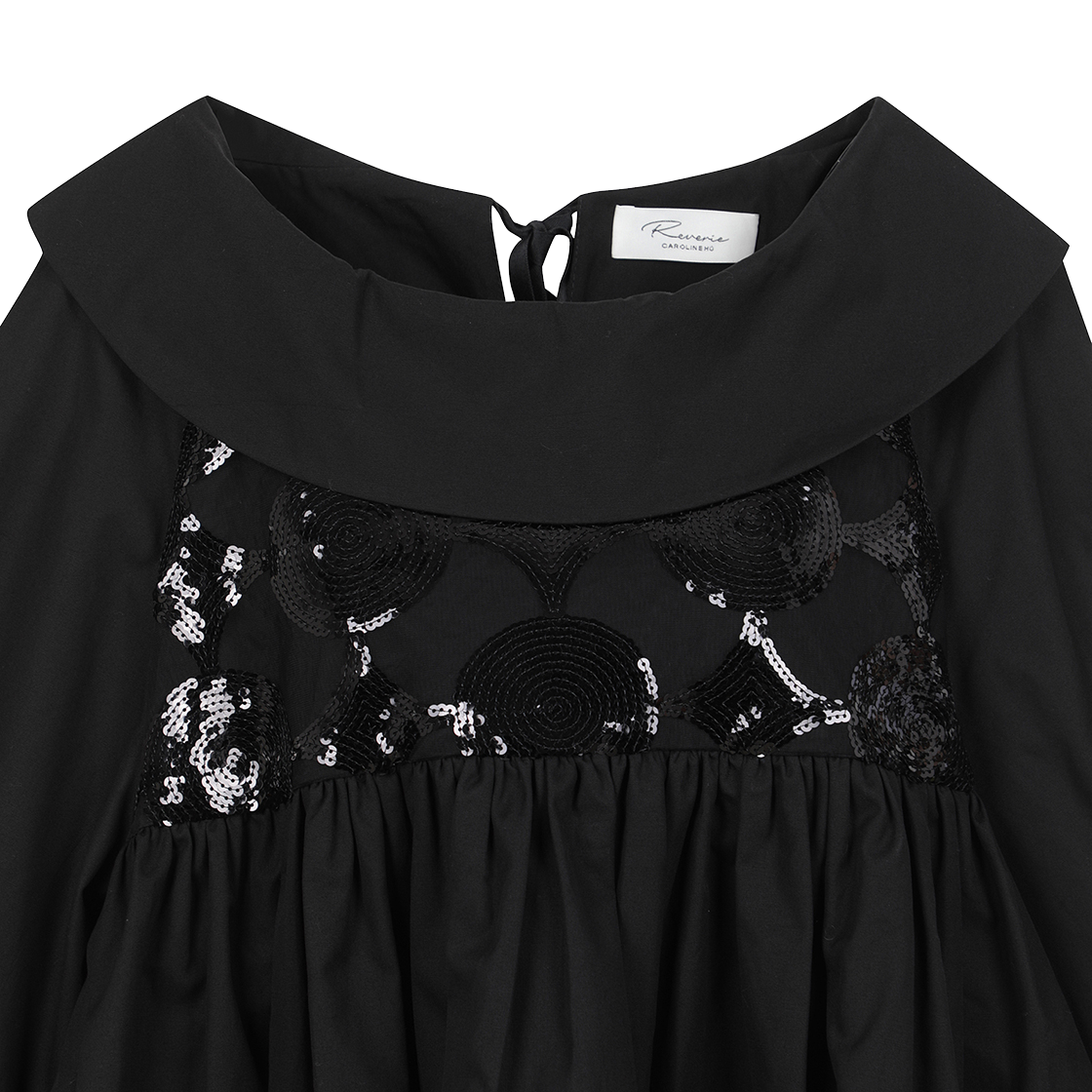 사랑스러운 볼륨감 있는 실루엣과 시퀸 디테일이 돋보이는 캐롤라인 후의 스타 패턴 시퀸 자수 탑입니다. - 전면의 시퀸 장식 - 후면과 소매 밑단의 리본 장식