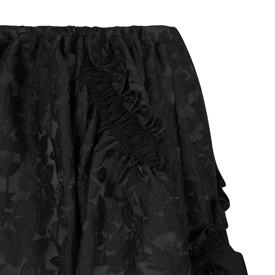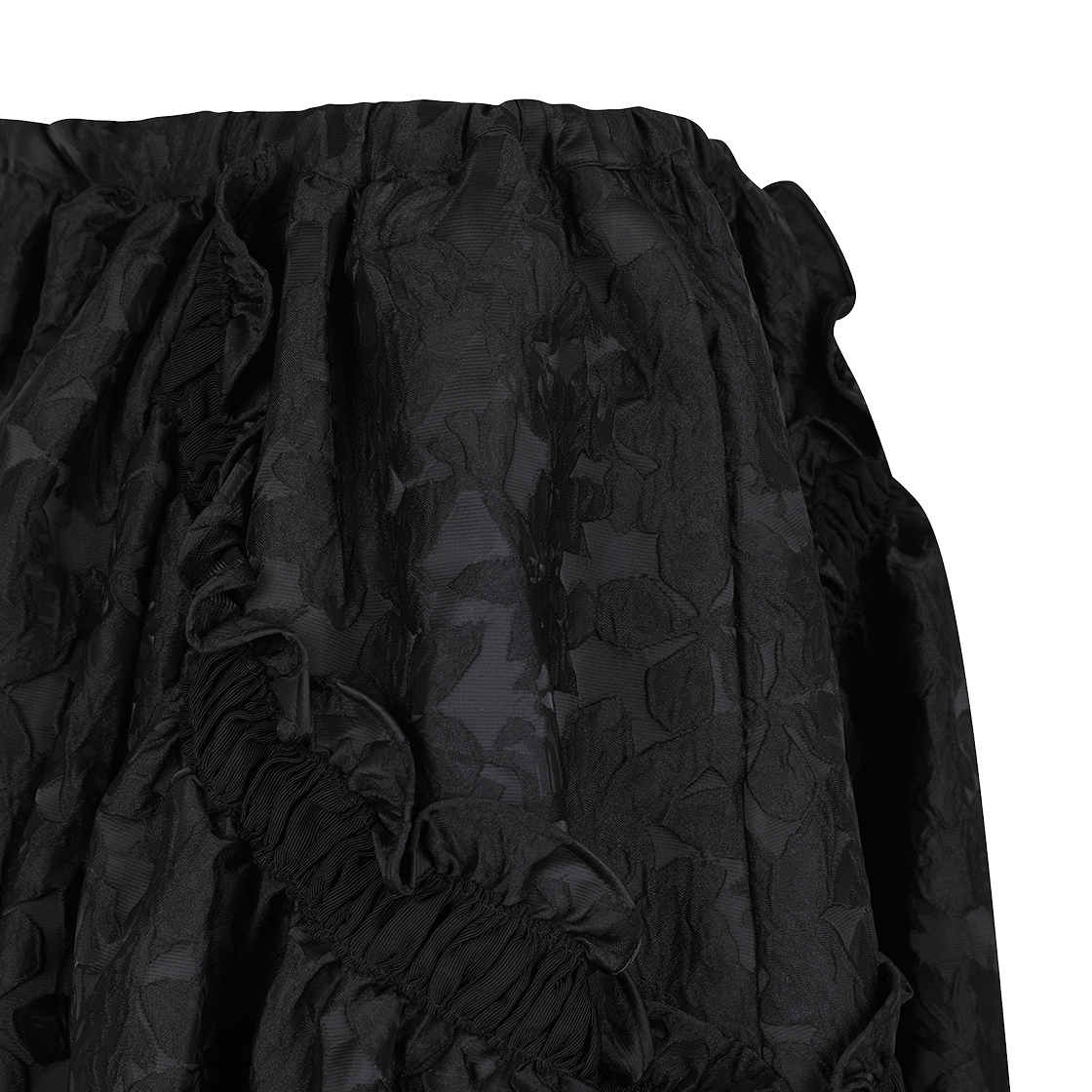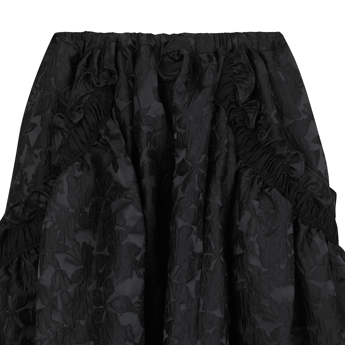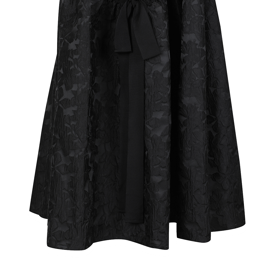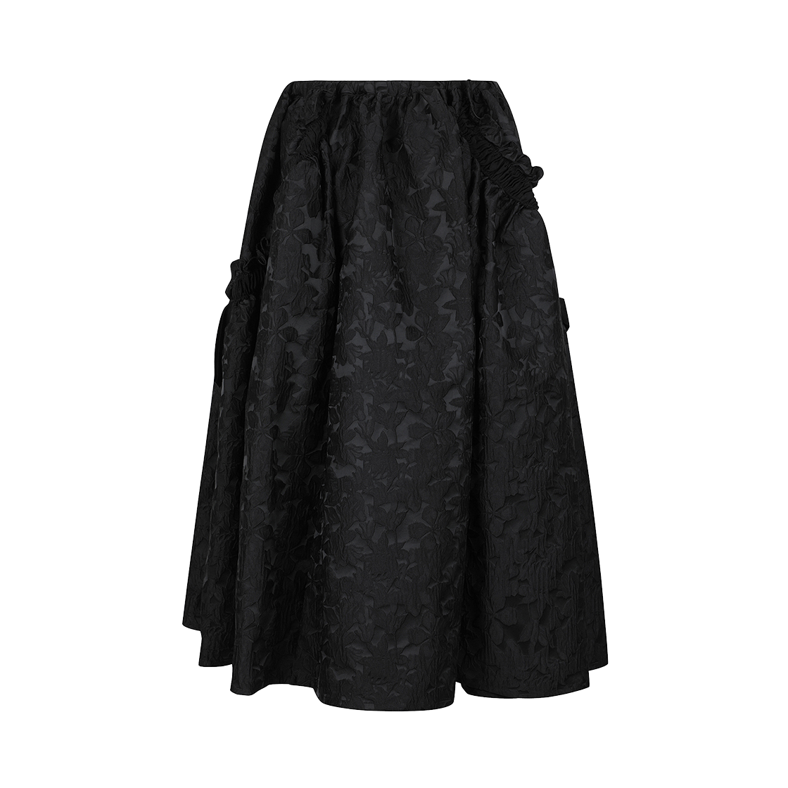 고급스러운 자카드 원단과 풍성한 기장감이 조화로운 캐롤라인 후의 자카드 스커트입니다. - 은은한 광택의 자카드 원단 - 허리의 주름 디테일과 측면의 맥시한 리본 장식