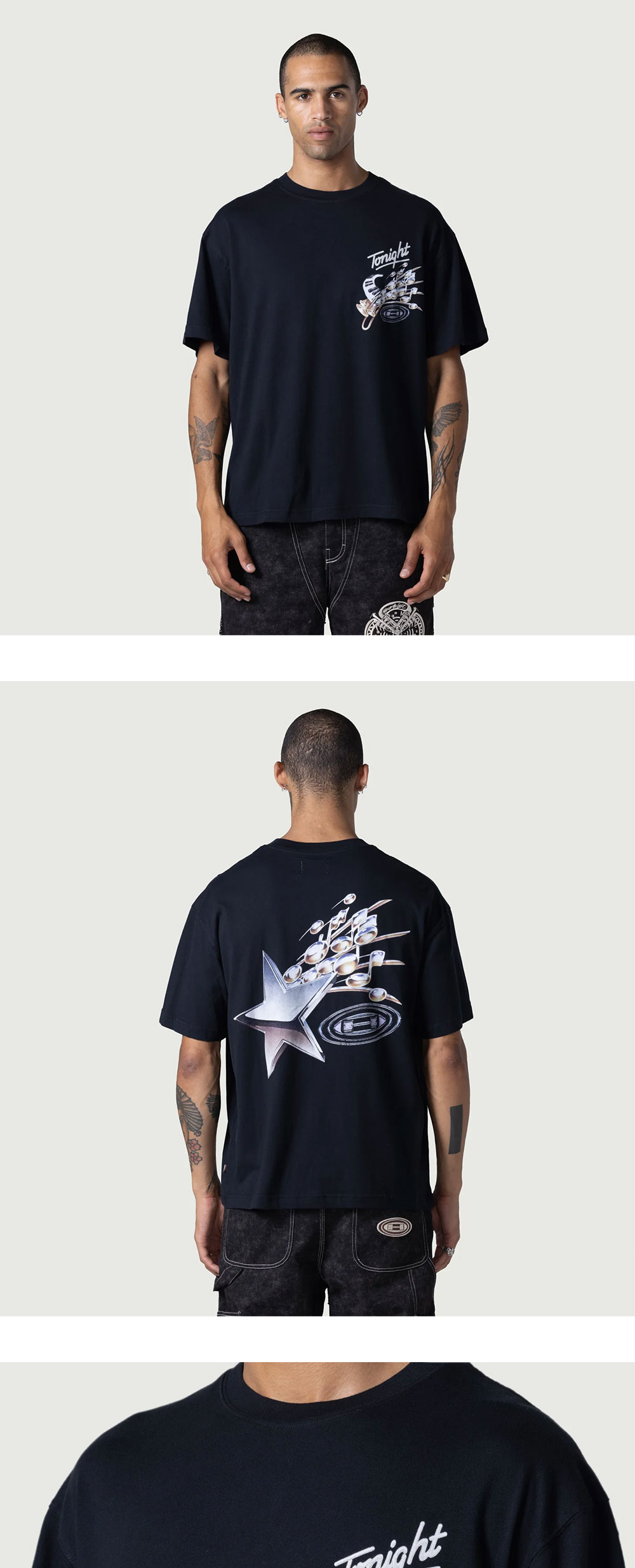 오너 더 기프트만의 과감한 아트워크 프린팅이 돋보이는 투나잇츠 뮤직 티입니다. - 빈티지 워싱 저지 원단 - 소매와 네크라인의 디스트레스드 디테일