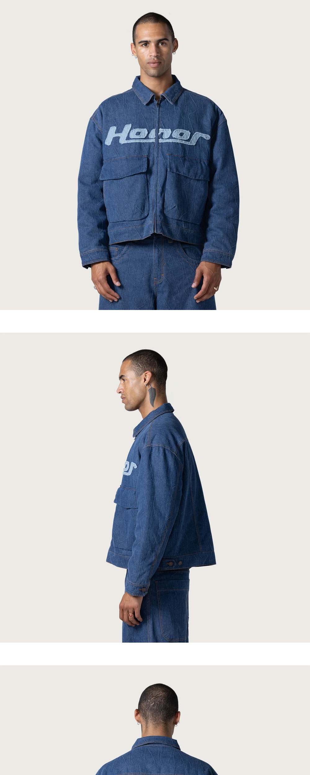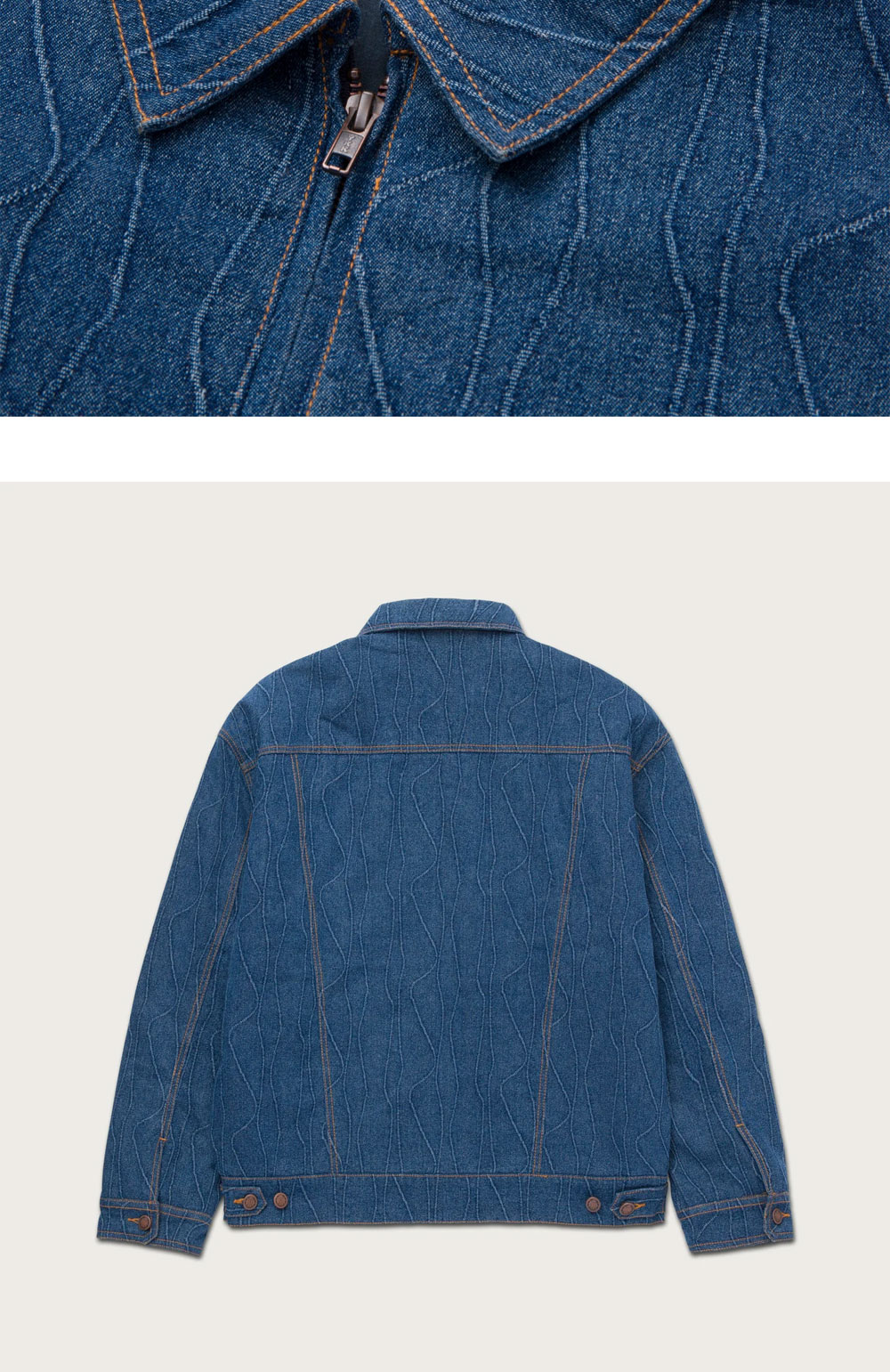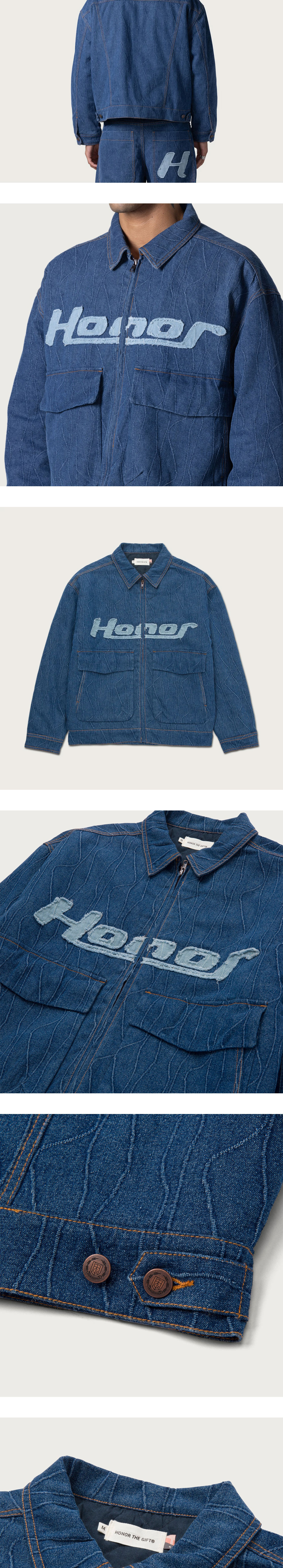 전면에 위치한 연청 컬러의 로고가 돋보이는 오너 더 기프트의 데님 집업 자켓입니다. - 전체적으로 적용된 불규칙한 패턴 디테일 - 전면 2개의 플랩 포켓 - 허리에 위치한 버튼으로 실루엣 조절 가능