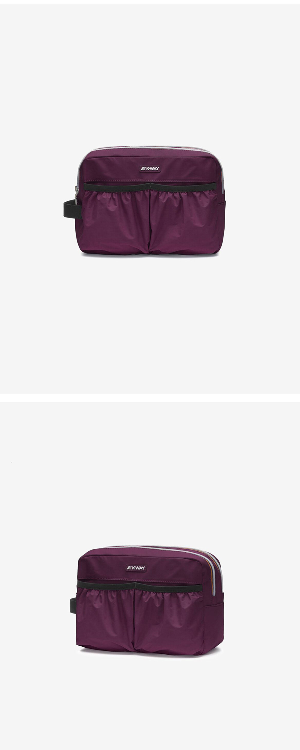 기능적 디자인을 가진 경량 여행 파우치입니다. 방수, 발수 및 방풍 기능의 립스탑 소재 두 개의 메인 K-WAY 지퍼 잠금 장치 앞 면에 두 개의 신축성 있는 포켓 다기능 내부 수납 공간 26cm x 19cm x 12cm