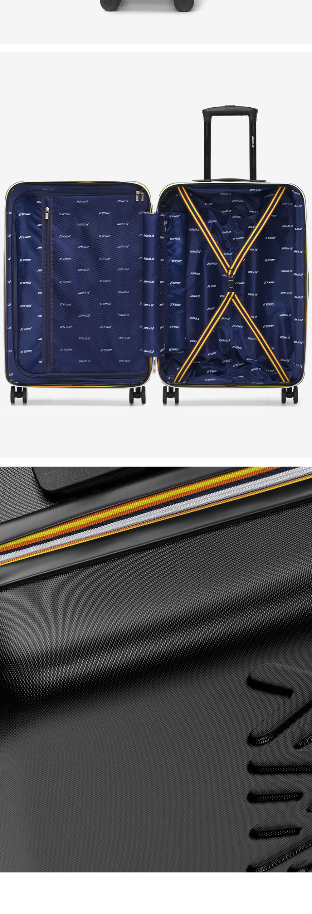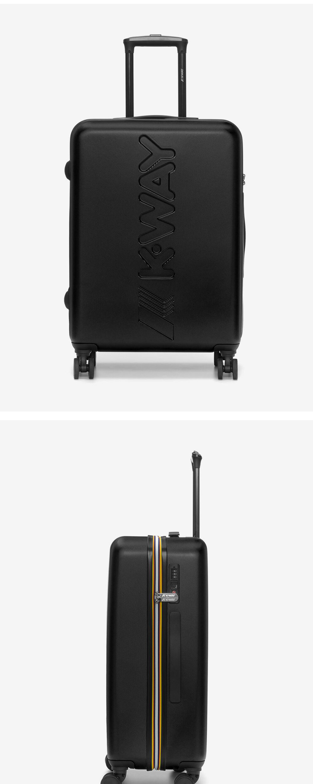 긴여행에 적합한 크기의 트롤리 입니다. 전면에 K-Way 큰 로고가 새겨져 있는 미디움 사이즈의 캐리어 이동성이 좋은 네 바퀴가 있으며, 까웨만의 아이코닉한 바야데르 테이프 특징 양방향 지퍼와 자물쇠로 마감 처리-양방향 지퍼와 자물쇠로 마감 처리 미듐 사이즈의 트롤리 (64x43x25cm) TSA Lock 적용, 360° 회전 가능한 이중 휠 내부에 포켓 및 스트랩 포함