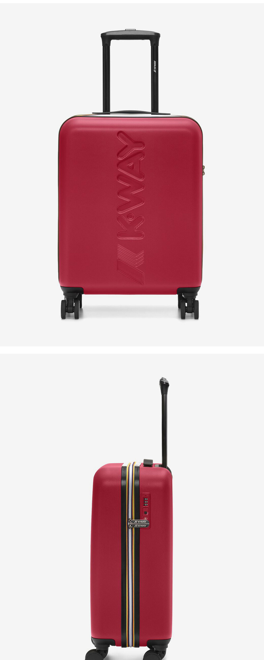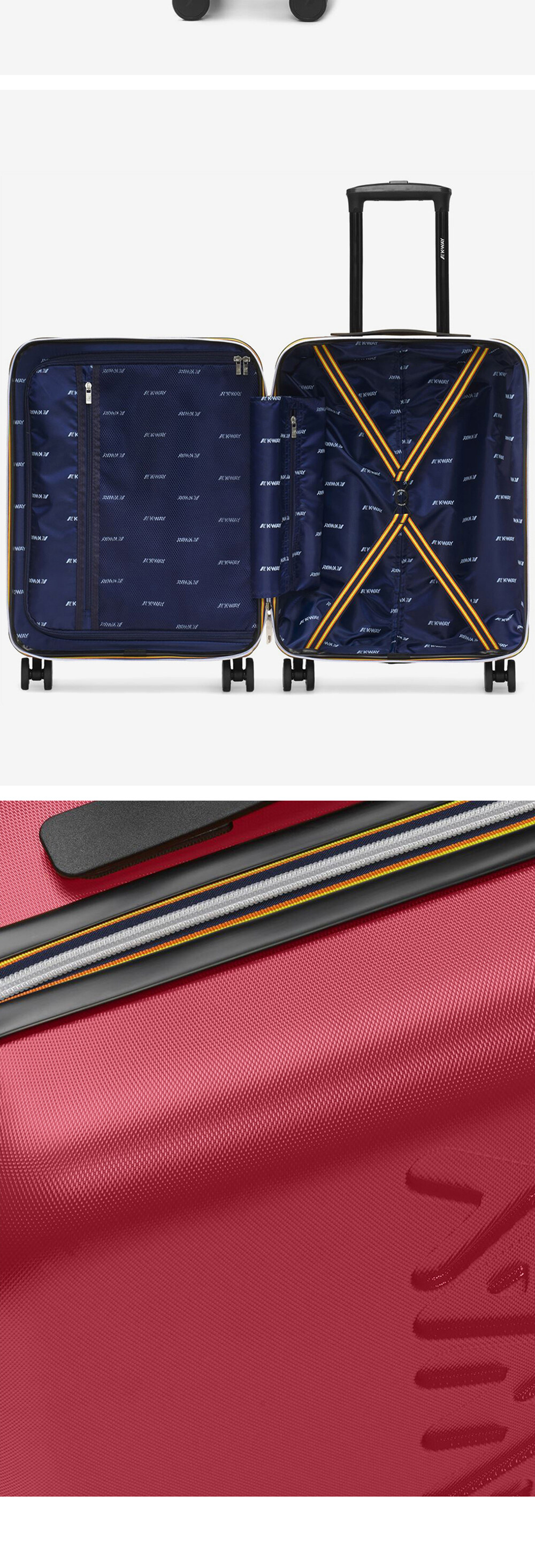 짧은 주말 여행이나 출장용으로 적합한 크기의 트롤리 입니다. 전면에 K-Way 큰 로고가 새겨져 있는 캐빈 사이즈의 캐리어 이동성이 좋은 네 바퀴가 있으며, 까웨만의 아이코닉한 바야데르 테이프 특징 양방향 지퍼와 자물쇠로 마감 처리 carry-on 사이즈의 트롤리 (55x40x20cm) TSA Lock 적용, 360° 회전 가능한 이중 휠 내부에 포켓 및 스트랩 포함