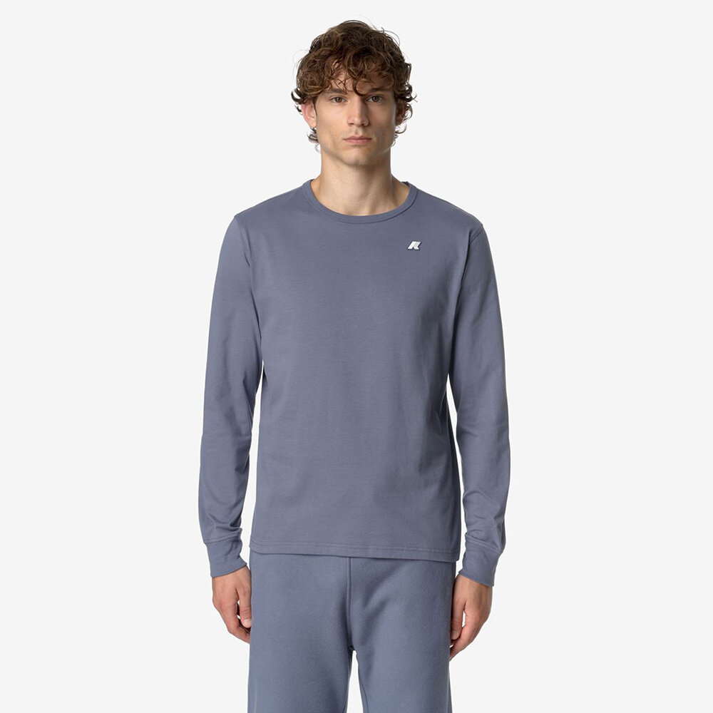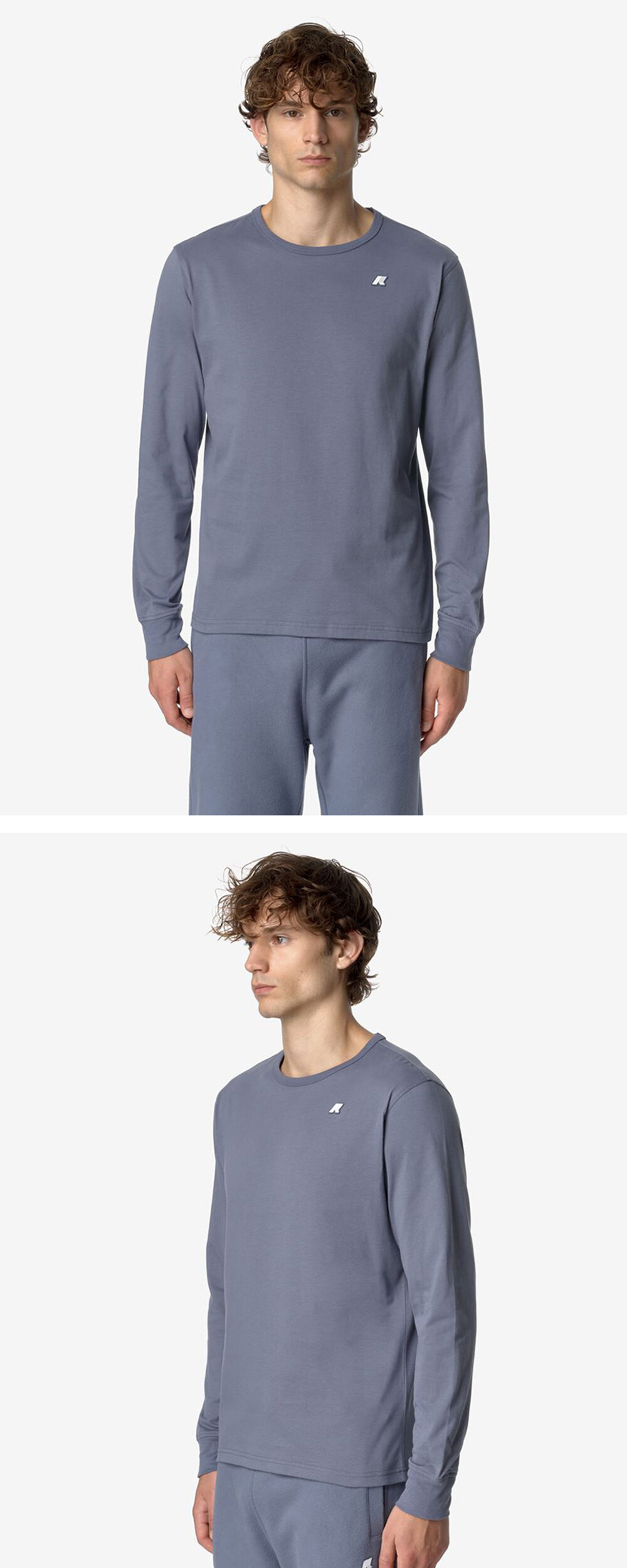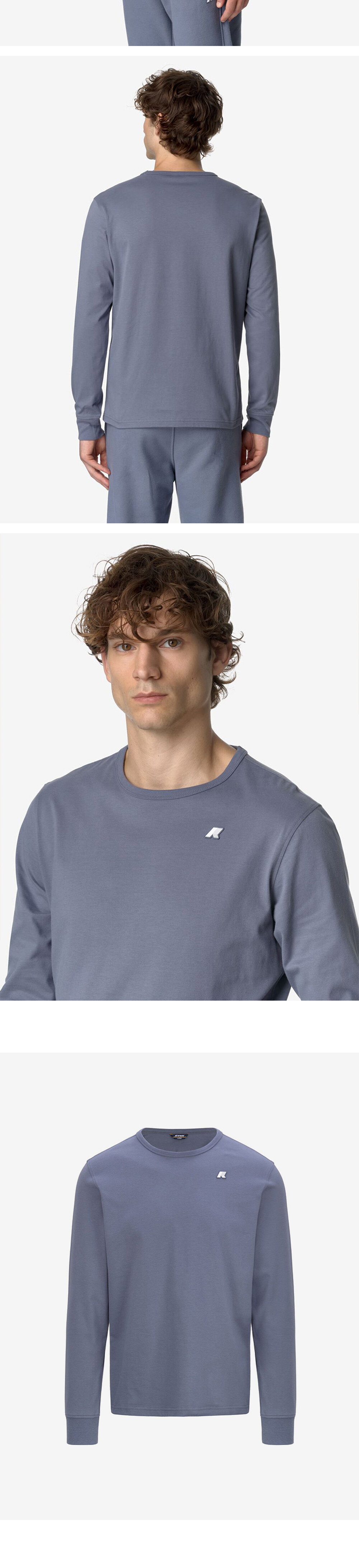 가벼운 순면 브러시드 저지의 벨벳 같은 질감과 운동복 스타일을 결합한 남성용 긴팔 티셔츠 골지 크루넥-실리콘 로고 패치 슬림핏