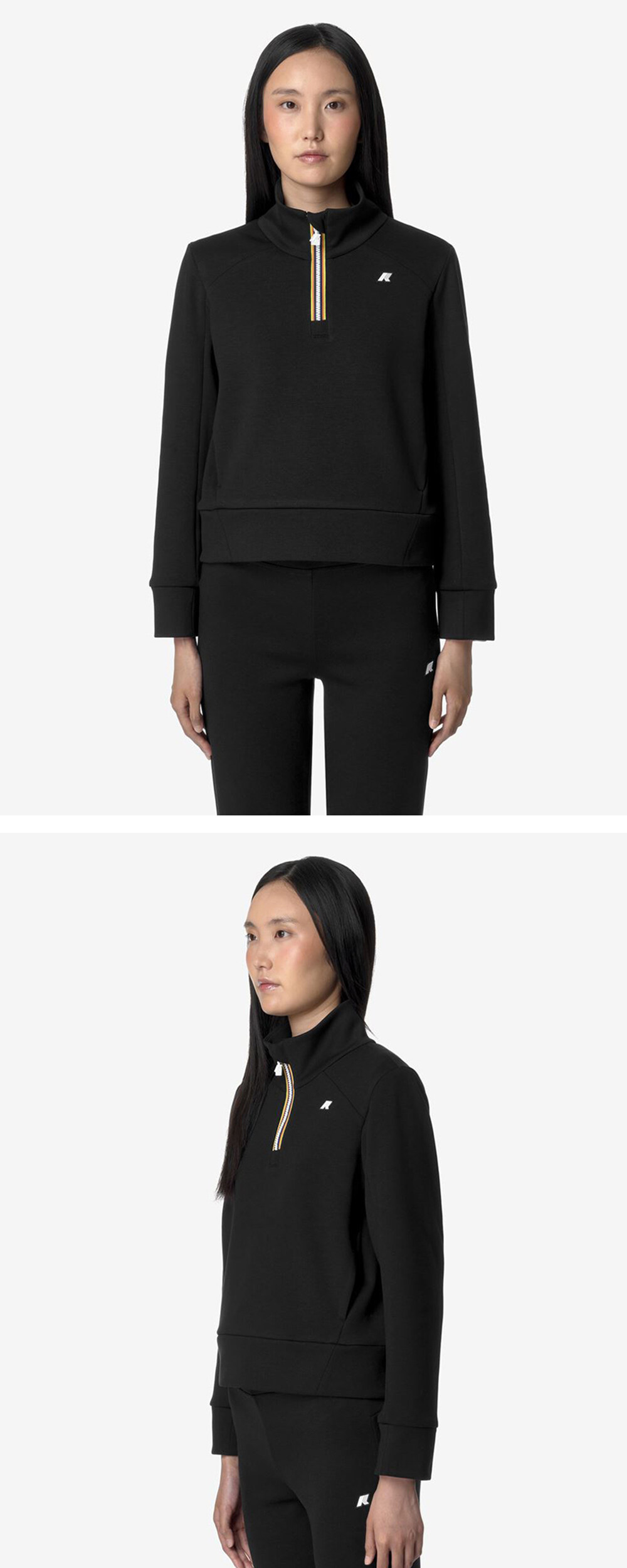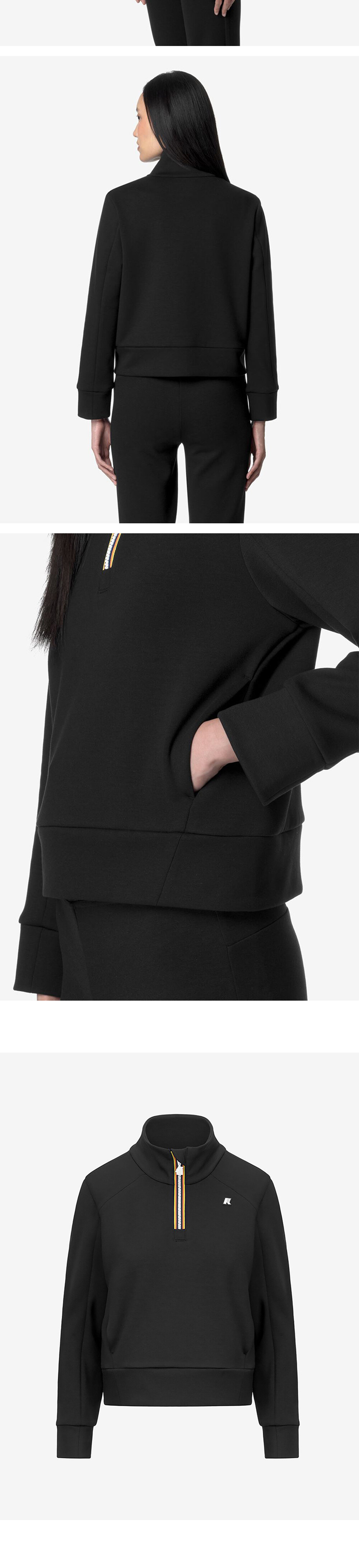 여가 시간과 스포츠를 위해 디자인 된 여성용 크롭 스웻셔츠입니다. 신축성 있는 매트 인터록 원단 하이 칼라, 하프 지퍼 클로저 대각선 포켓골지 밑단과 소맷단 레귤러핏