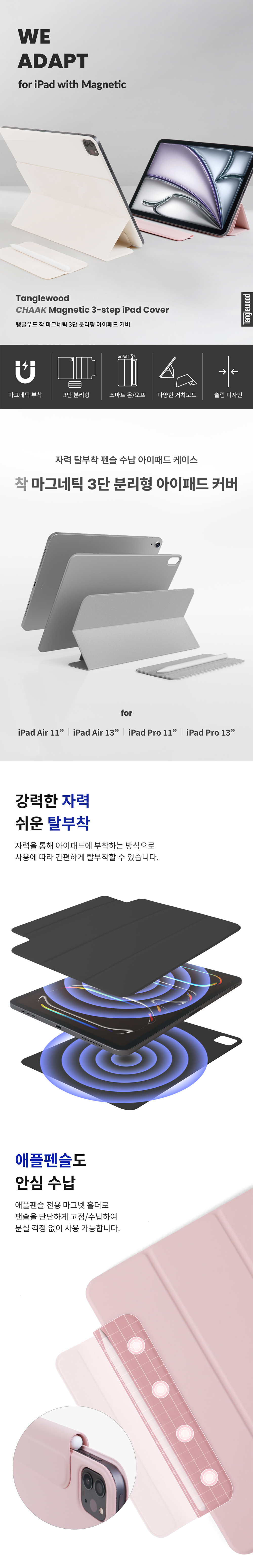 탱글우드 착 마그네틱 3단 분리형 아이패드 커버 에어 M3 M2 M1 7/6/5/4세대 11형 블랙