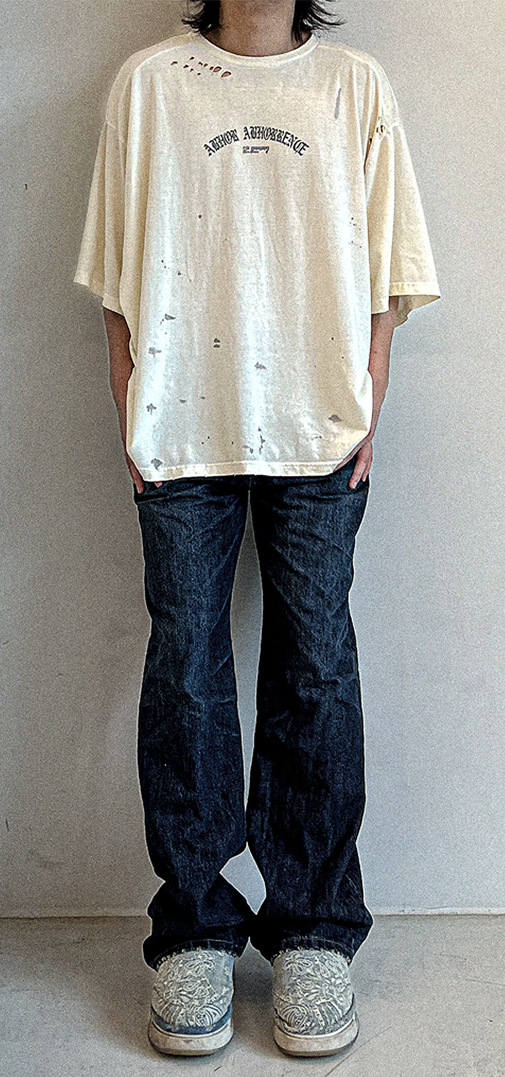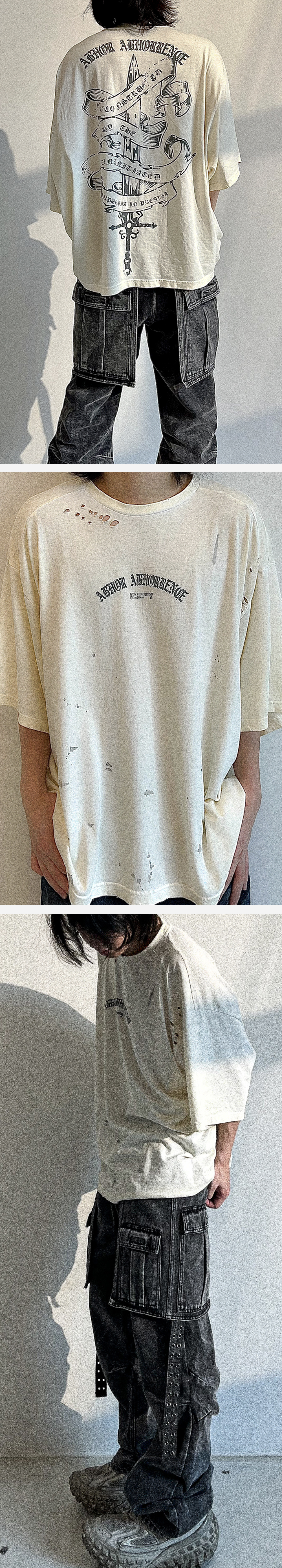 - 루즈 핏 - 빈티지 가먼트워시 - 크루넥 - 레터링,그래픽 프린트 - 빈티지 디스트레스드 가공 - cotton 100% - Size (어깨/가슴/암홀/총장) [단위 : cm] 1 : 63 / 76 / 31 / 72 2 : 64.5 / 78 / 33 / 74.5