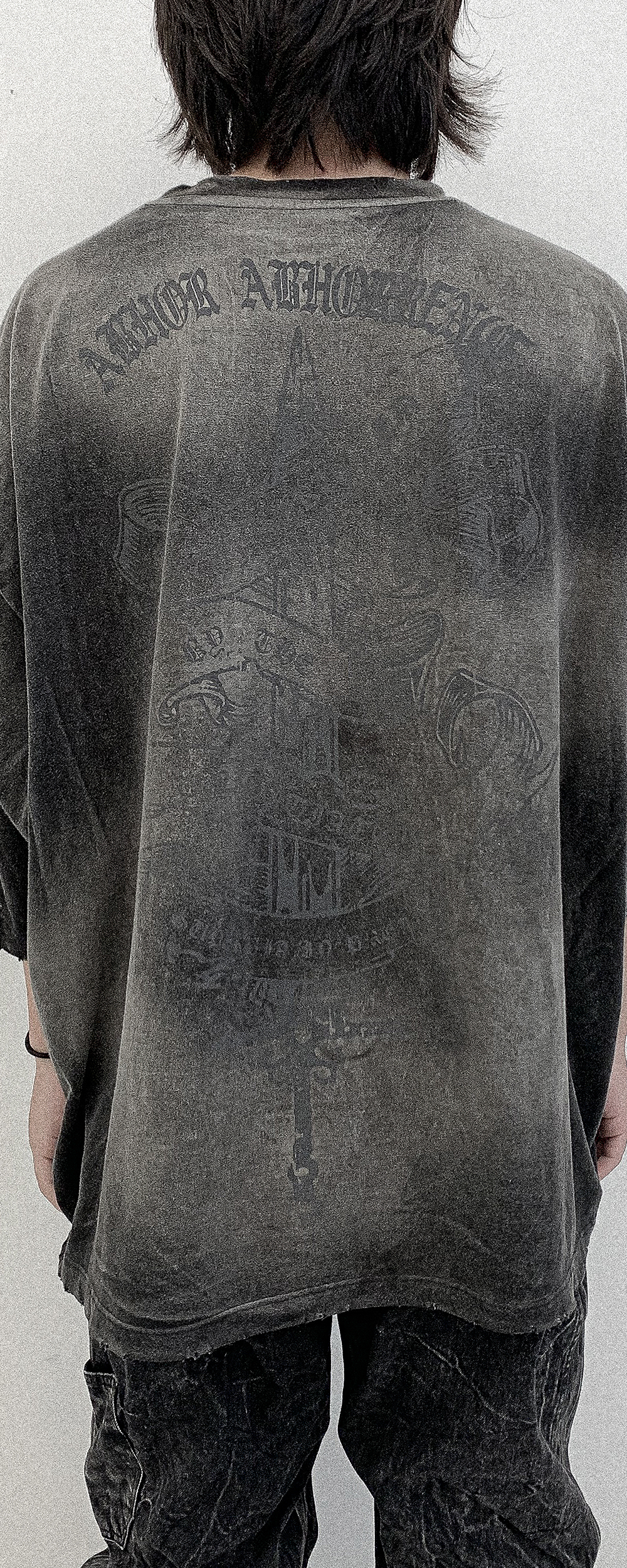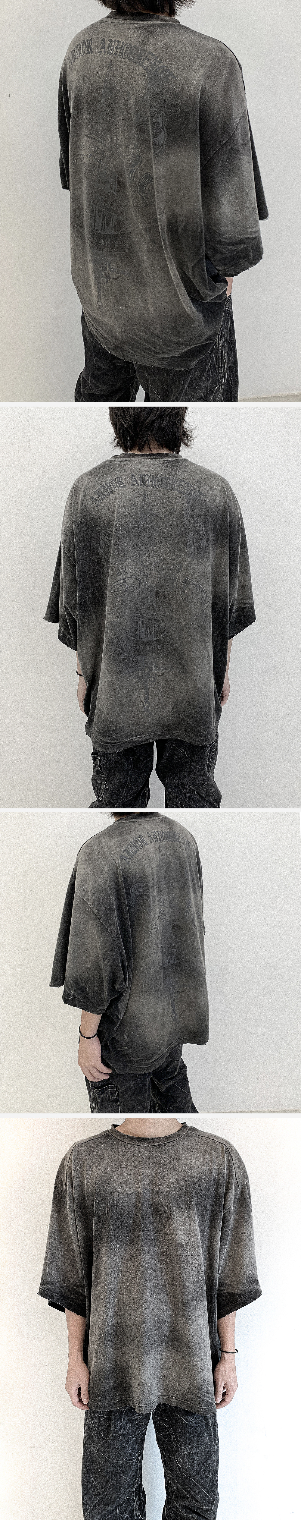 - 루즈 핏 - 빈티지 가먼트워시 - 크루넥 - 레터링,그래픽 프린트 - 빈티지 디스트레스드 가공 - cotton 100% - Size (어깨/가슴/암홀/총장) [단위 : cm] 1 : 63 / 76 / 31 / 72 2 : 64.5 / 78 / 33 / 74.5