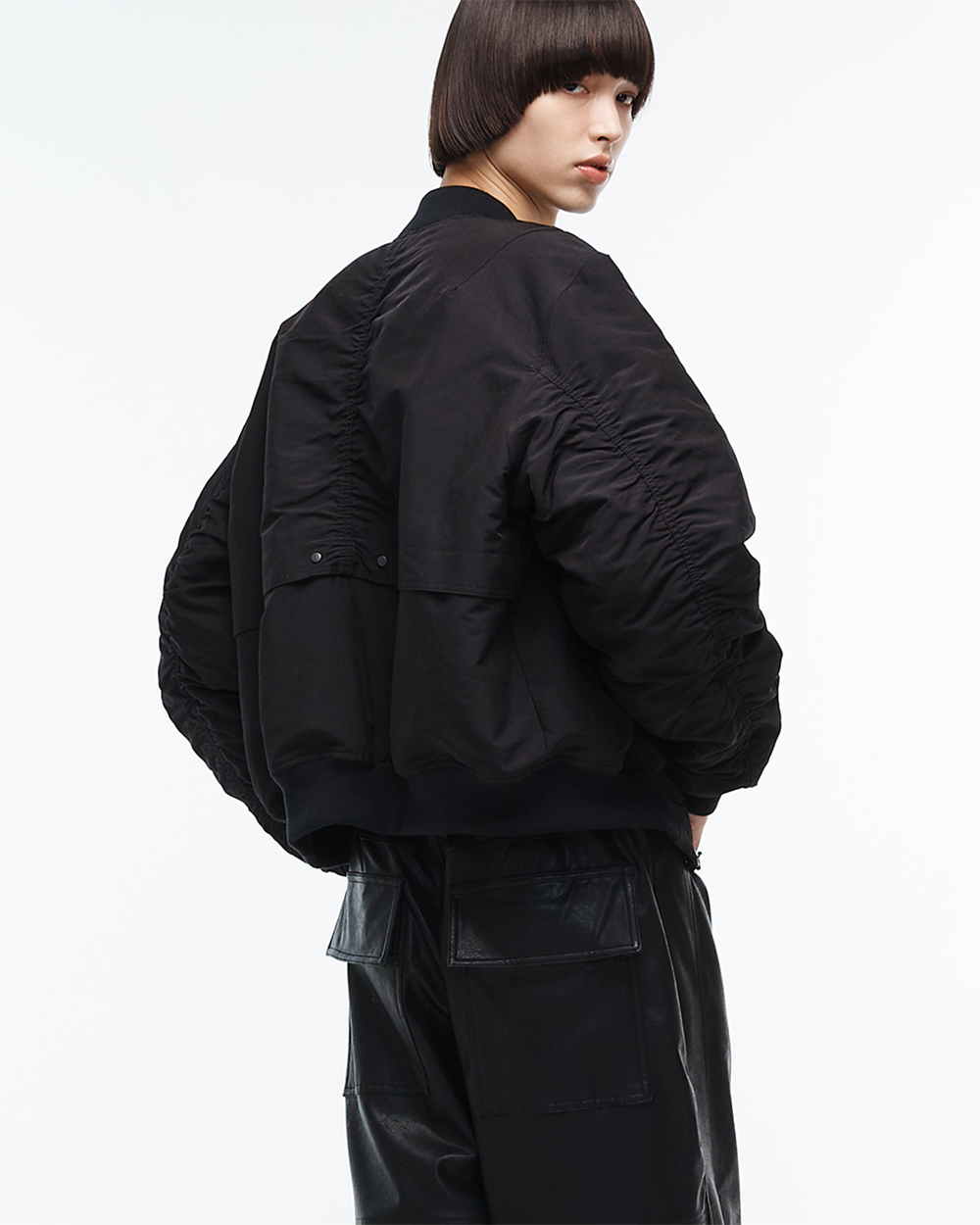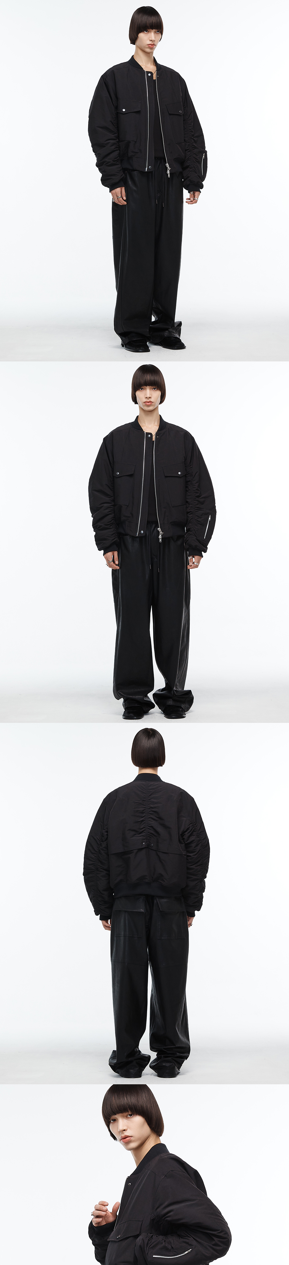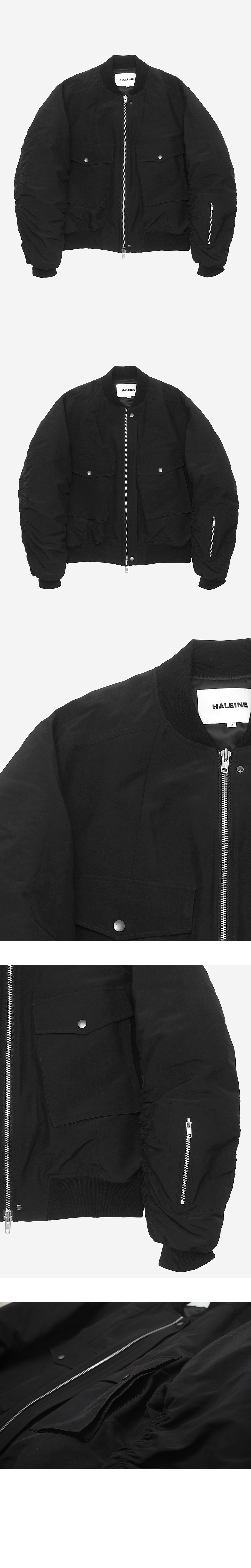 래귤러한 실루엣과 입체적인 디테일들의 조화가 세련되면서도 실용적인 봄버 자켓입니다. 탄탄하고 매트하면서도 각도에 따라 은은한 윤택감이 감도는 나일론/폴리에스터 혼방 소재가 사용되었습니다. 다양한 절개 라인들과 포켓 디테일, 셔링 등 요소들이 매력적인 제품입니다. 3온스 안감을 사용하여 적당한 볼륨감과 보온성을 주어 초겨울까지 데일리로 착용하기 좋습니다. -DETAIL- 입체 절개 등판 플리츠 디테일 2WAY 플랩 카고 포켓 소매 및 등판 셔링 디테일 소매 패치 포켓 플라켓을 이용한 2WAY 연출