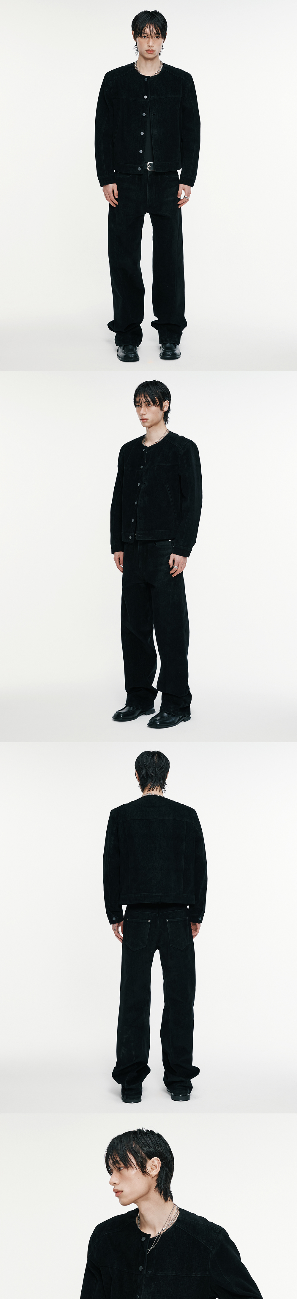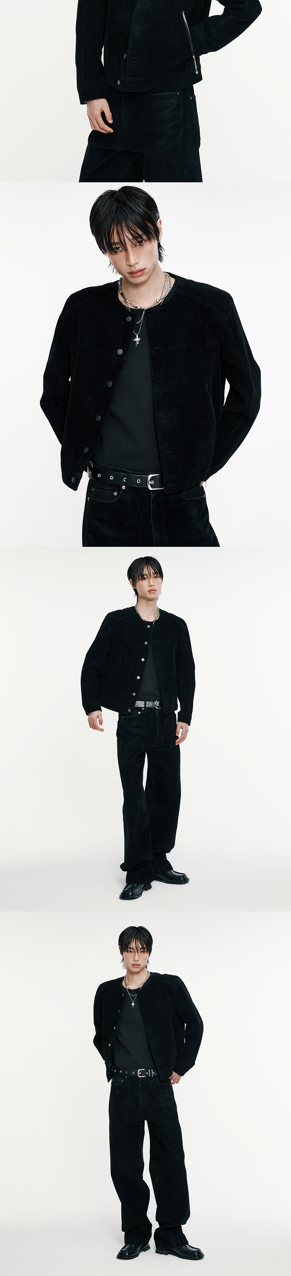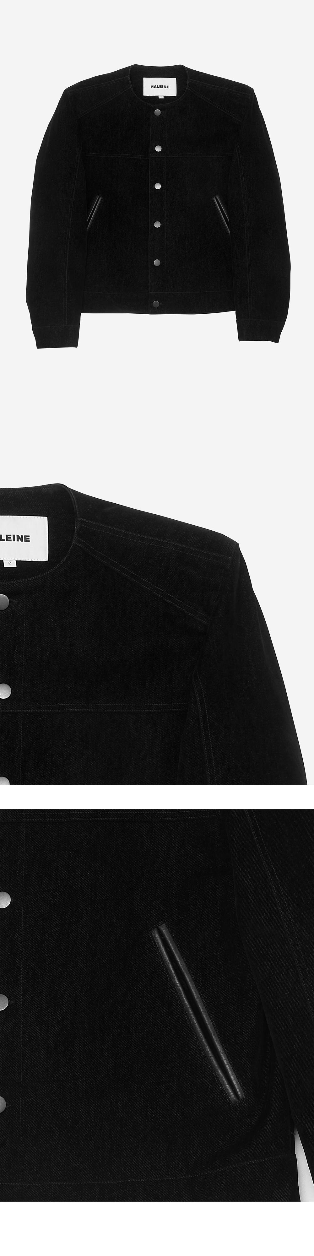 직선적인 날렵한 실루엣이 매력적인 카라리스 자켓입니다 . 벨벳 이펙트 가공이 된 코튼 소재와 메탈 및 레더 등 소재 믹스를 통해 우아하면서 고급스러운 무드를 보여줍니다. 입체적인 절개라인과 어깨 패드 작업을 통한 탄탄하면서도 세련된 실루엣으로 캐주얼하면서도 트렌디하게 연출하기 좋은 제품입니다. -DETAIL- 라운드 형태의 넥 라인 어깨 패드 사용 입체 절개 리얼 레더 포켓 커프스 형태의 소매 메탈 버튼