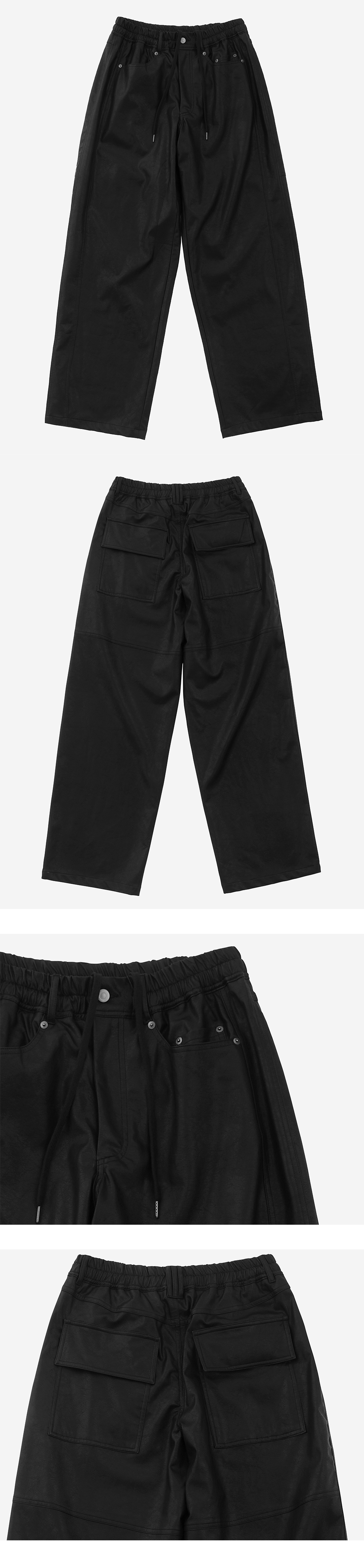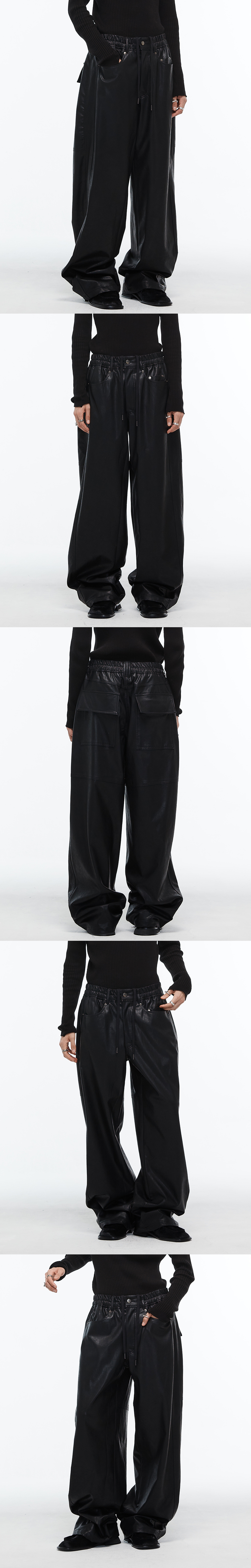 입체적인 절개 라인이 돋보이는 와이드 팬츠입니다. 은은한 광택감이 매력적인 페이크 레더가 사용되었으며, 릴렉스한 실루엣과 데님팬츠에서 차용된 디테일들의 조화가 매력적인 제품입니다. _x000B_ - DETAIL - 신축성있는 허리 밴딩 및 드로우스트링 데님에서 차용된 5-포켓 디자인 및 리벳 디테일 플랩 형태의 백포켓 옆면 수직 절개 뒷면 수평 절개