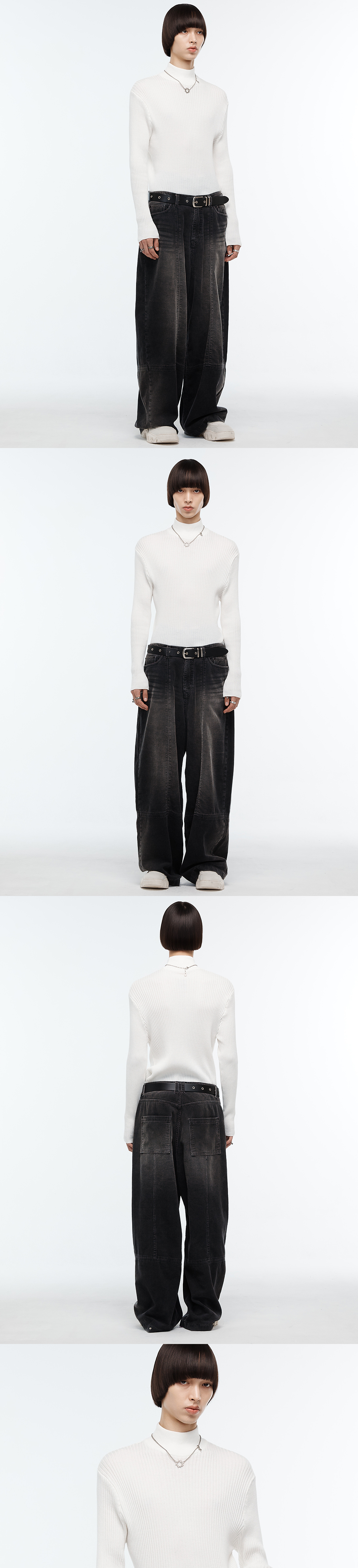 부드러운 코튼 원사를 편직하여 제작한 골지 니트 터틀넥 입니다. 넥라인과 소매, 밑단은 몸판 대비 얇은 골로 편직한 것이 특징이며, 타이트한 실루엣으로 이너로 활용도가 높은 제품입니다. -DETAIL- 터틀넥 슬림 핏