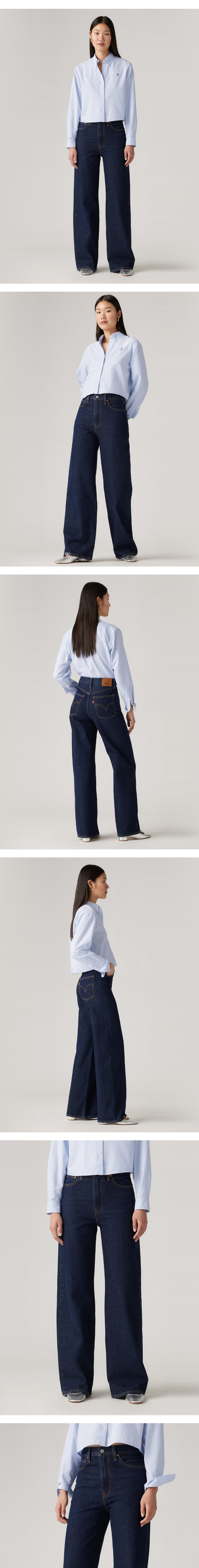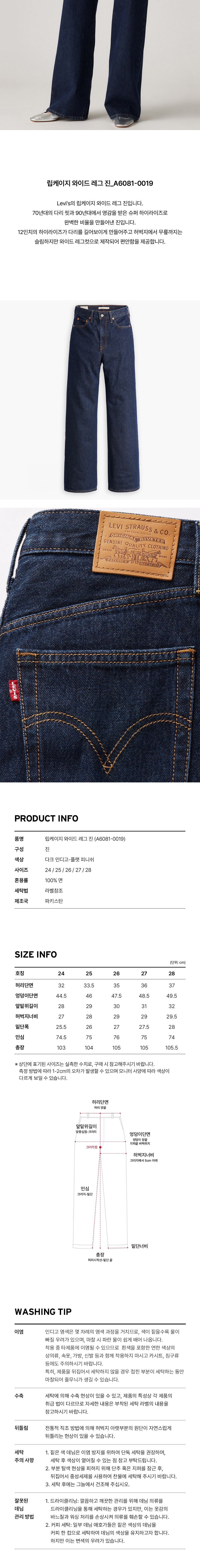 Levi's의 립케이지 와이드 레그 진입니다. 70년대의 핏과 90년대의 빈티지에서 영감 받아 디자인되었습니다. 12인치의 슈퍼 하이라이즈가 허리를 더욱 날씬해 보이게 만들어주며 슬림하면서 편안한 착용감을 선사합니다.
