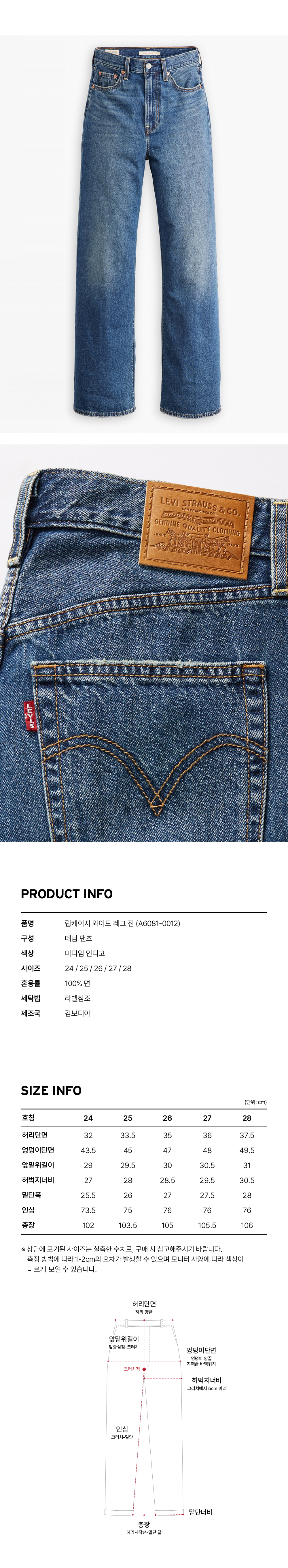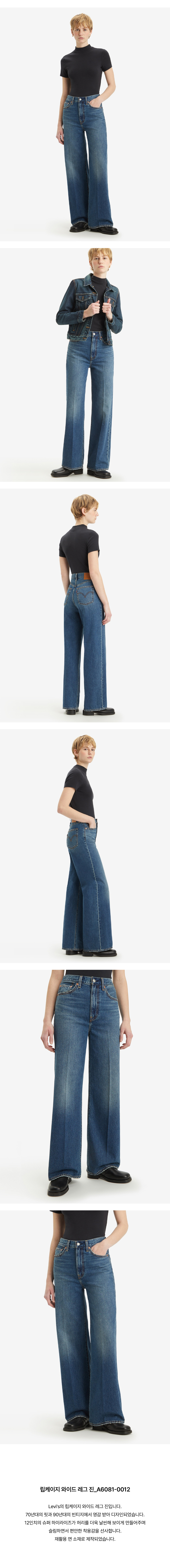 Levi's의 립케이지 와이드 레그 진입니다. 70년대의 핏과 90년대의 빈티지에서 영감 받아 디자인되었습니다. 12인치의 슈퍼 하이라이즈가 허리를 더욱 날씬해 보이게 만들어주며 슬림하면서 편안한 착용감을 선사합니다. 재활용 면 소재로 제작되었습니다.