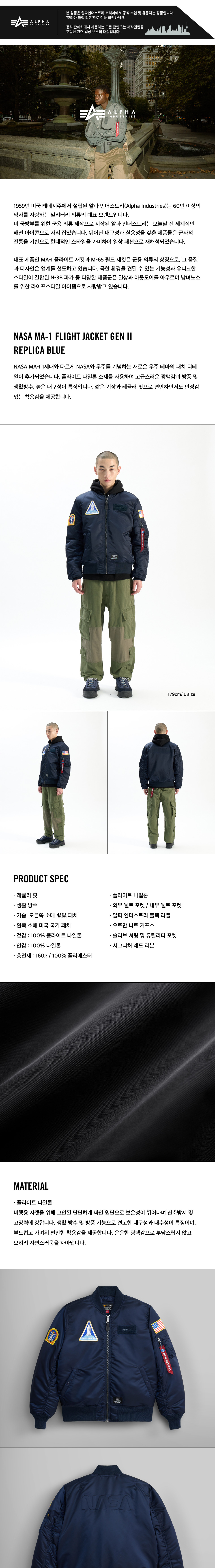 알파 인더스트리 나사 MA-1 플라이트 재킷 젠 II 레플리카 블루