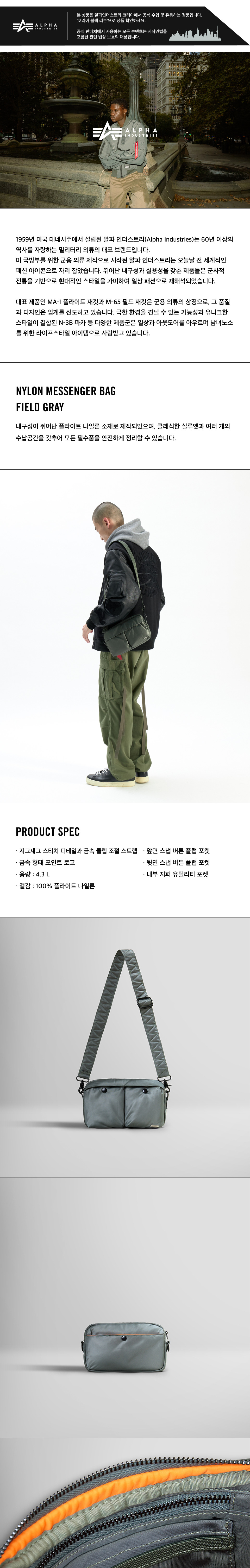 알파 인더스트리 나일론 메신저 백 필드 그레이