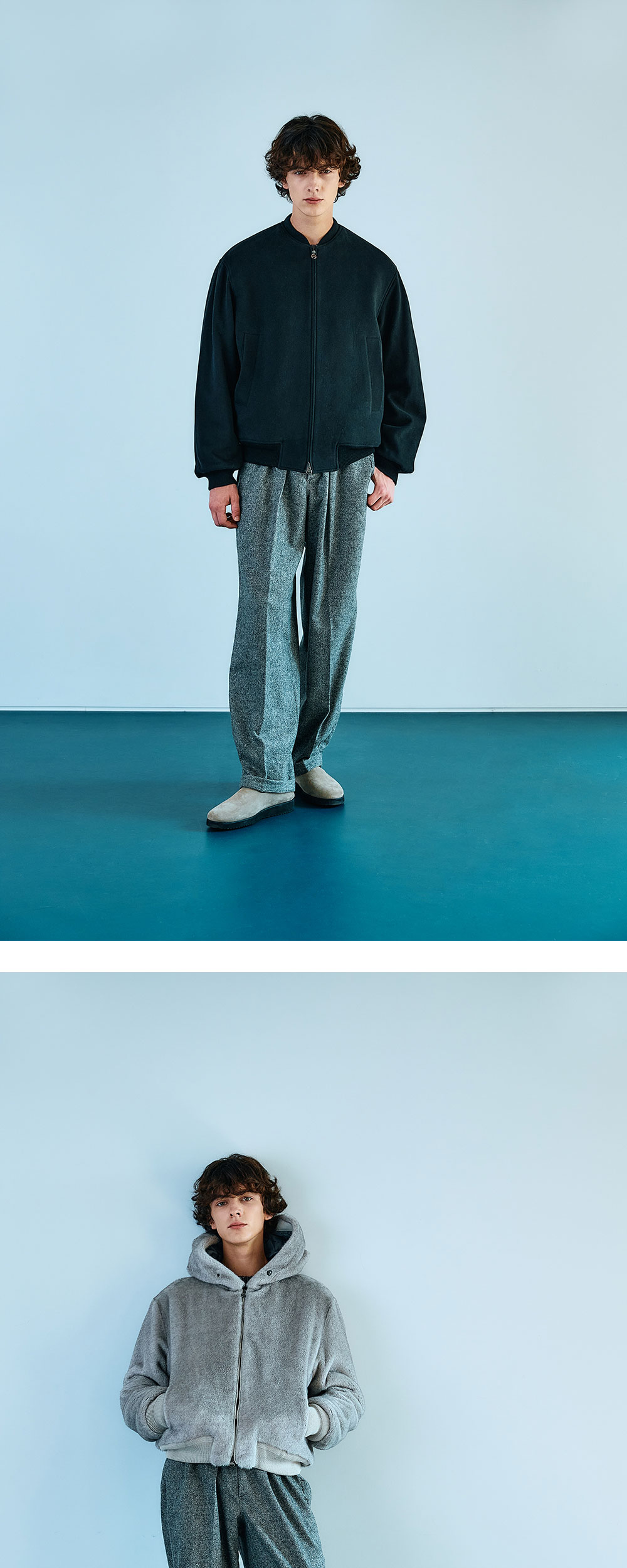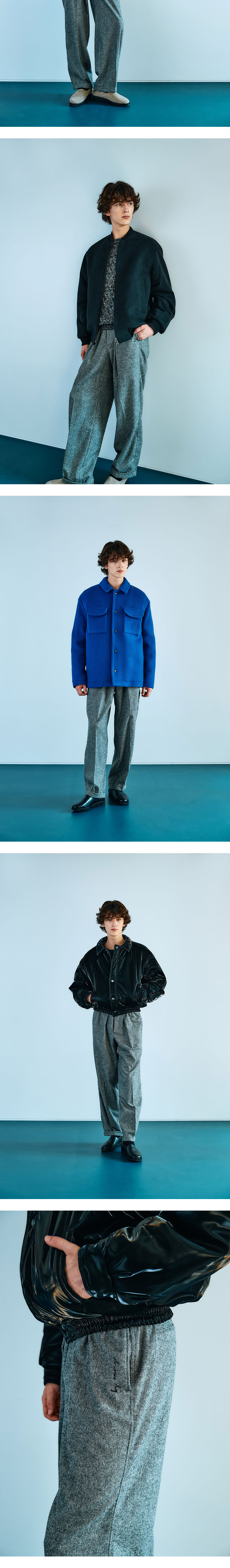 - MODEL : 183CM 70KG TOP - 1 (M) BOTTOM - M - BOTTOM SIZE WAIST : 1 SIZE (~31), 2 SIZE (32~34) - Japanese wool-silk blend - Wide fit - Waist banding - logo string - Single pleats - Side logo embroidered