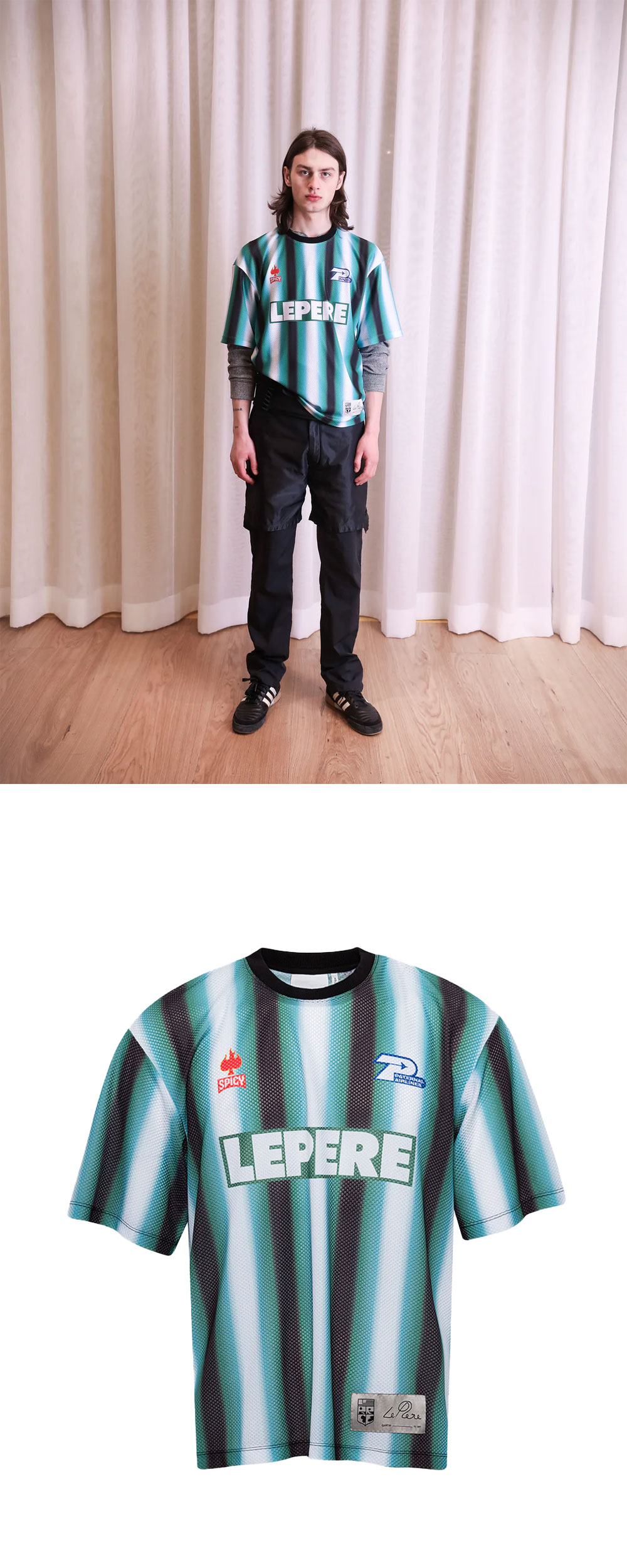 스트라이프 패턴과 스폰서 그래픽이 축구 유니폼을 연상시키는 르 뻬흐의 메쉬 티셔츠입니다. - 박시 핏 - 메쉬 소재 - 후면 요크 디테일
