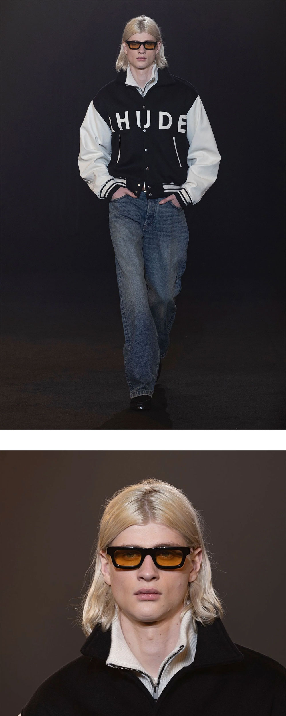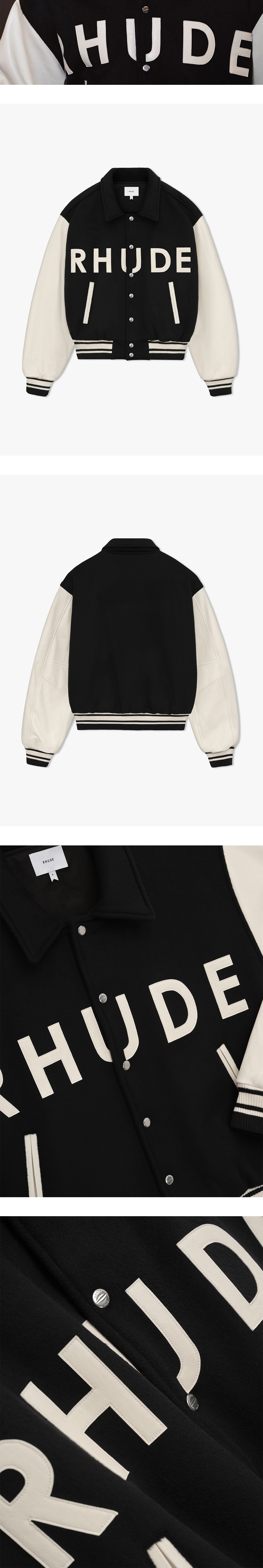 전면에 위치한 브랜드 로고 자수가 돋보이는 루드의 컬리지에이트 자켓입니다. - 스탠다드 핏 - 알약 모양의 스냅 버튼 클로징 디테일