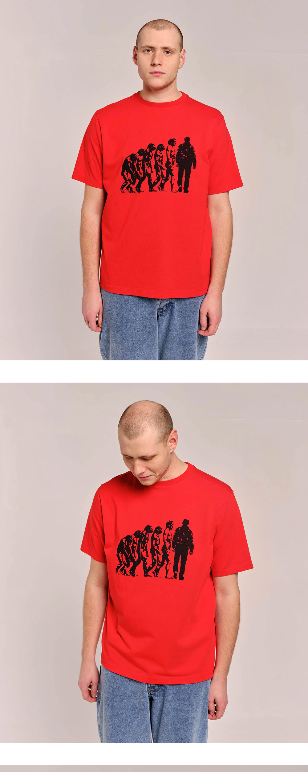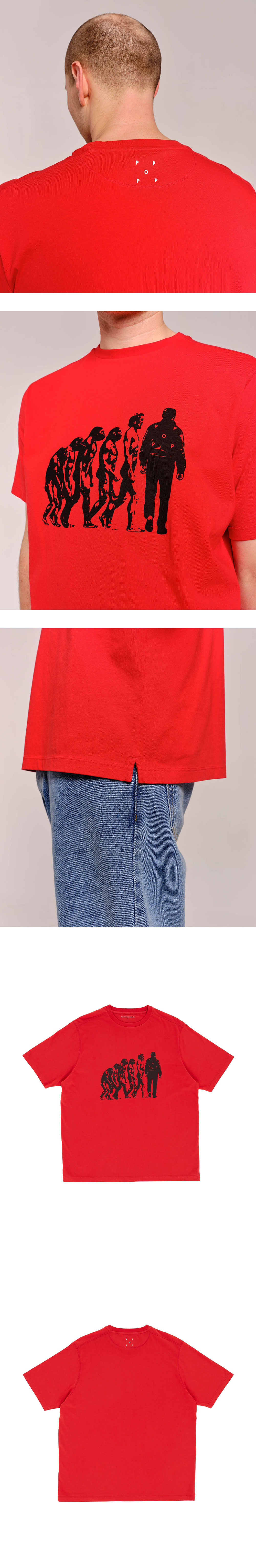 인류의 진화 과정이 프린팅된 팝 트레이딩 컴퍼니의 티셔츠입니다. - 밑단 슬릿 디테일 - 뒷목 로고 프린팅