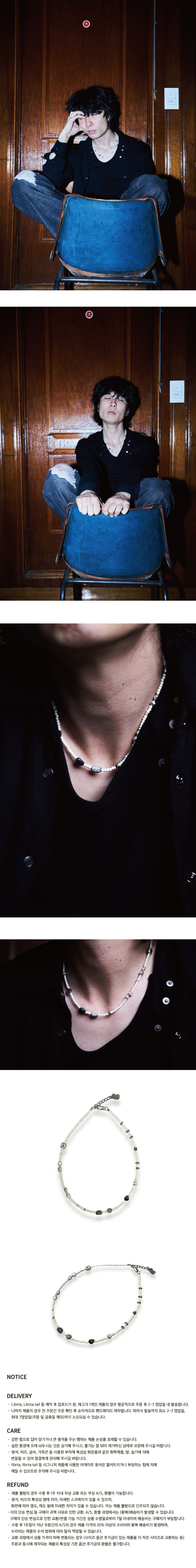 원석, 비즈, 금속, 가죽끈 등 사용된 부자재 특성상 화장품과 같은 화학제품, 땀, 습기에 의해 변질될 수 있어 청결하게 관리해 주시길 바랍니다.