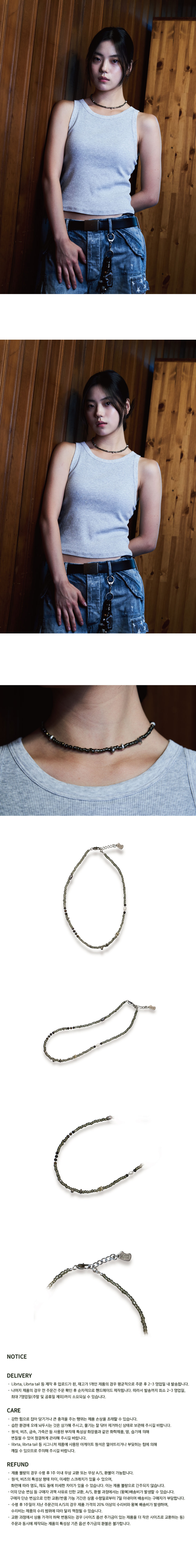 원석, 비즈, 금속, 가죽끈 등 사용된 부자재 특성상 화장품과 같은 화학제품, 땀, 습기에 의해 변질될 수 있어 청결하게 관리해 주시길 바랍니다.