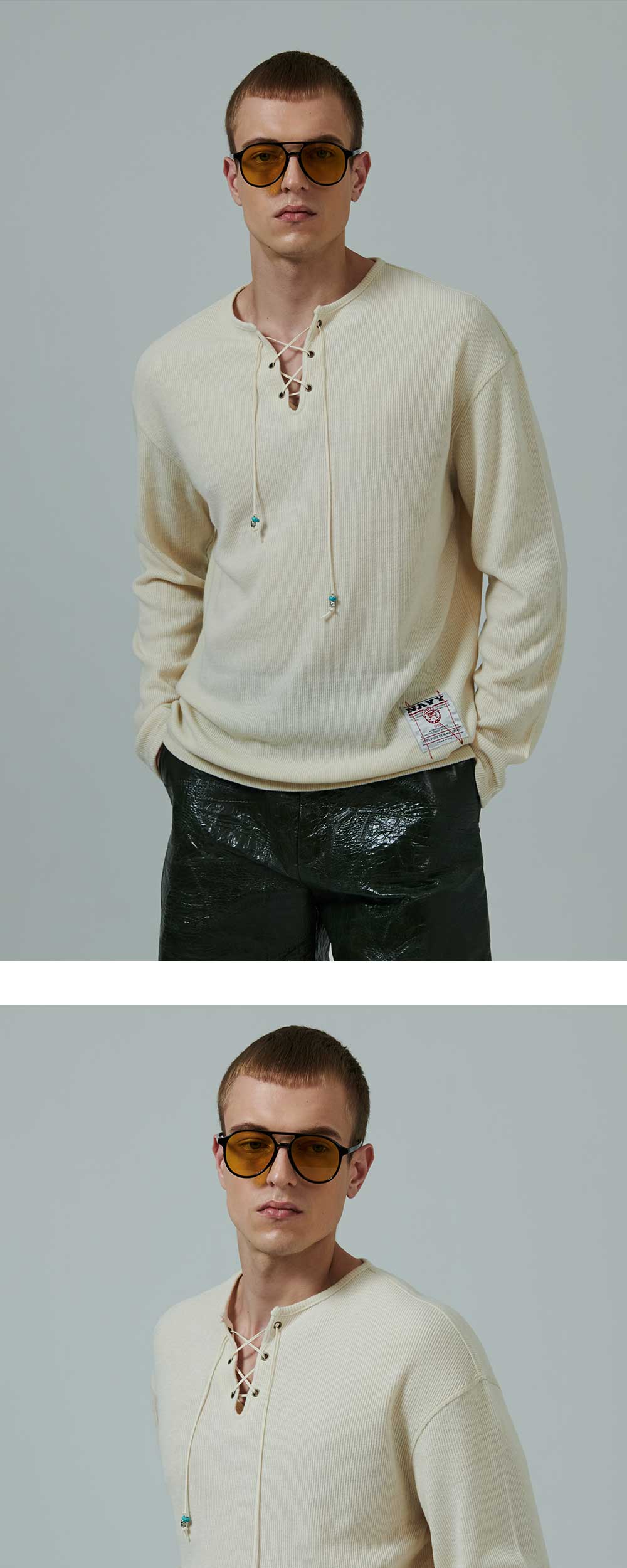 ㆍ컬렉션 라인의 90년대 웨스턴 무드에서 영감을 받아 제작된 헨리넥 니트 ㆍ90년대 방식 제작된 패턴과 울 혼방소재의 니트 원단을 사용한 오리지널리티의 복각 ㆍ빈티지 가공된 아일렛과 스웨이드 스트링 등 러프하게 마감된 빈티지 디테일 ㆍ실버 컬러의 주얼리와 터키석으로 완성된 스트링 마감 디테일 ㆍ남녀공용 착용