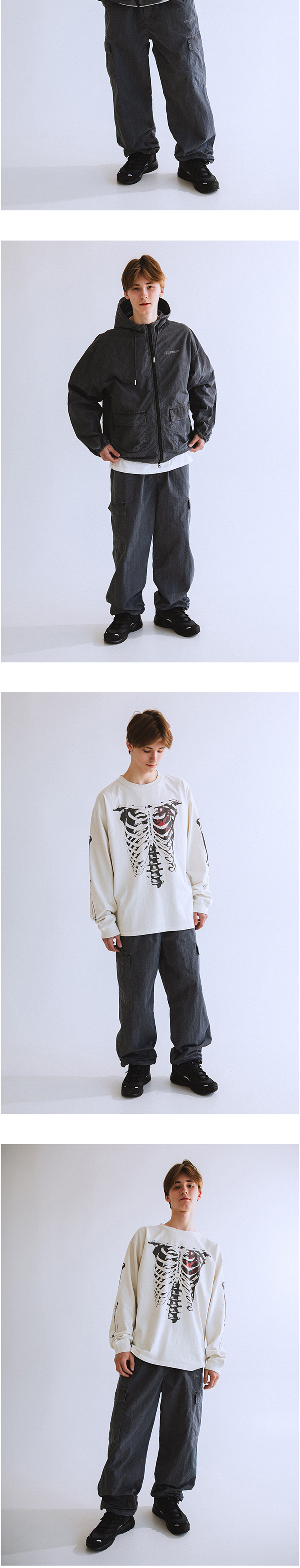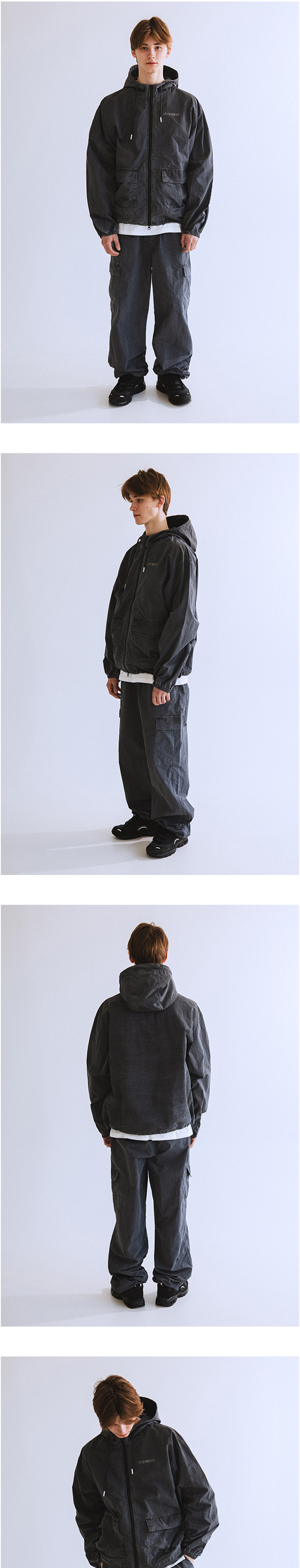 나일론 소재의 원단을 피그먼트 염색 가공하여 빈티지한 컬러감과 세탁 시 수축현상을 최소화 하였습니다. 현대적인 카고 팬츠 디자인을 채택했으며, 보다 더 와이드하고 넉넉한 실루엣을 갖고 있습니다.