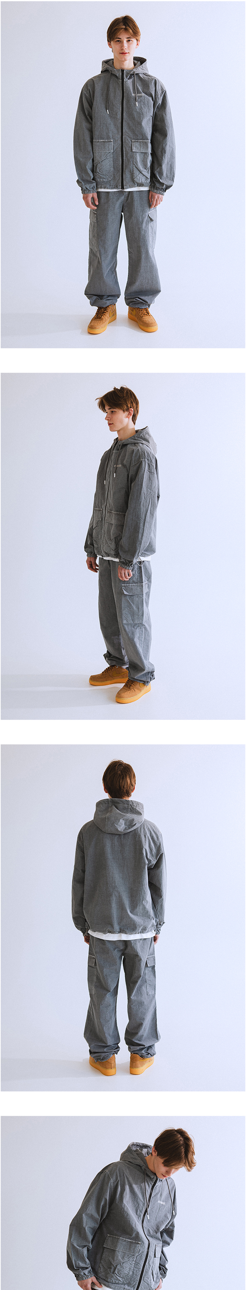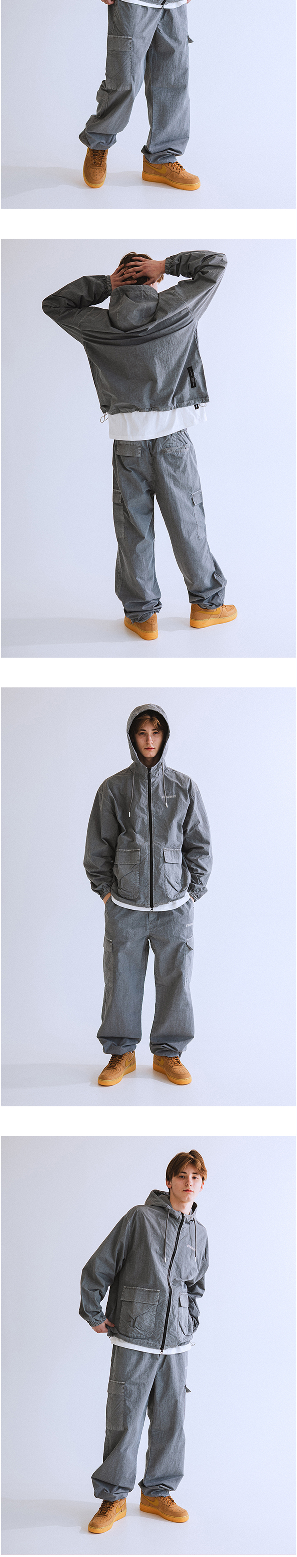 나일론 소재의 원단을 피그먼트 염색 가공하여 빈티지한 컬러감과 세탁 시 수축현상을 최소화 하였습니다. 현대적인 카고 팬츠 디자인을 채택했으며, 보다 더 와이드하고 넉넉한 실루엣을 갖고 있습니다.
