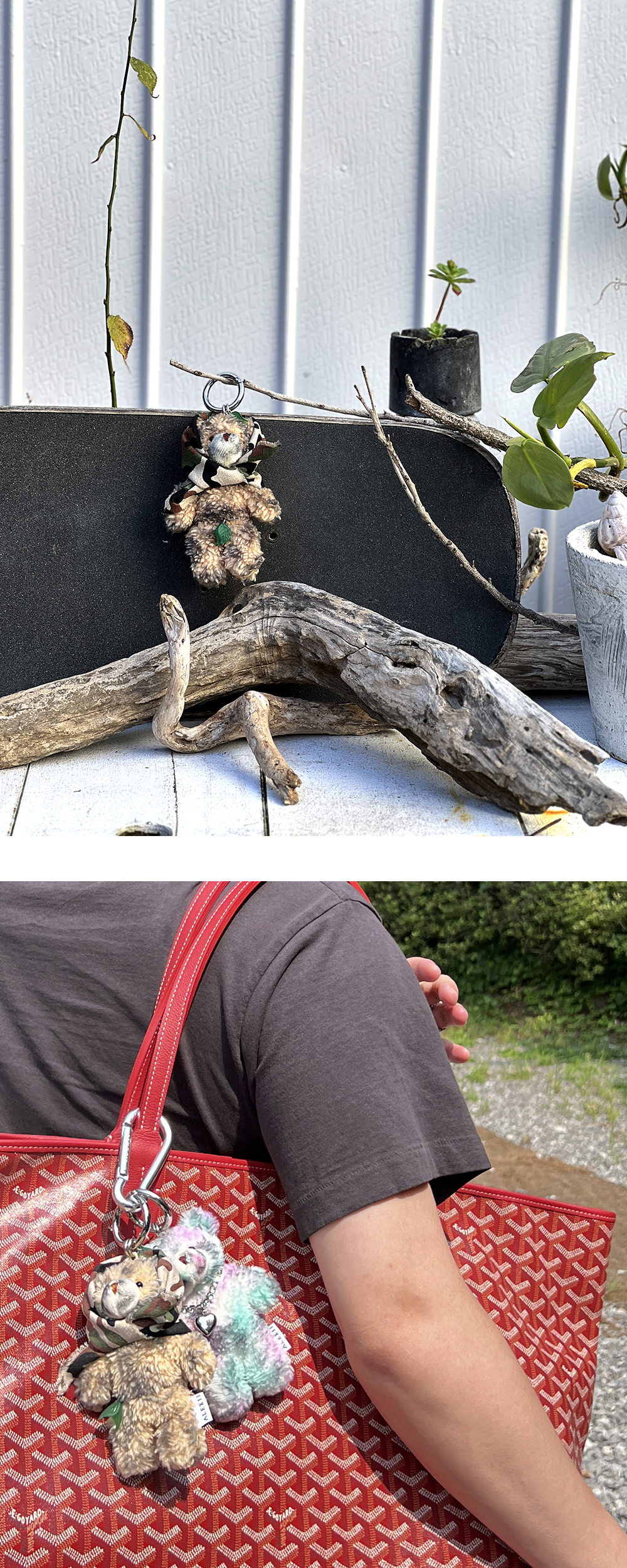 카모무늬의 천 소재로 스카프를 두른 곰돌이 키링입니다. 핸드메이드로 더티가공 염색처리를 하였으며 머플러는 탈부착이 가능합니다. - YELLOW - POLYESTER 100% - USED EFFECT - CAMOUFLAGE PATTERN BANDANA SCARF - ALEXII SIGNATURE PENDANT - SILVER-TONE METAL HOOK CLOSURE - REMOVABLE BANDANA SCARF - ZINC + RHODIUM PLATING