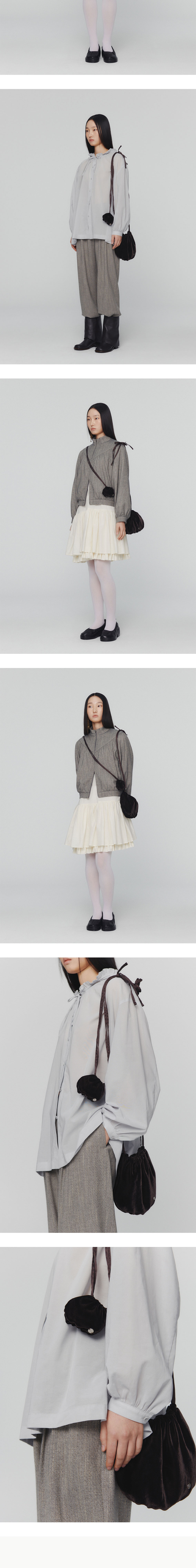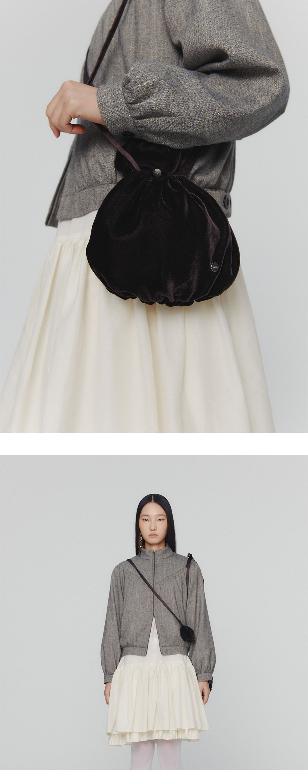 부드러운 벨벳 소재로 제작된 아모멘토의 미니 크로스백입니다. - 자연스러운 셔링 디자인 - 어깨 패드 및 정면 우측 하단 로고 각인 디테일