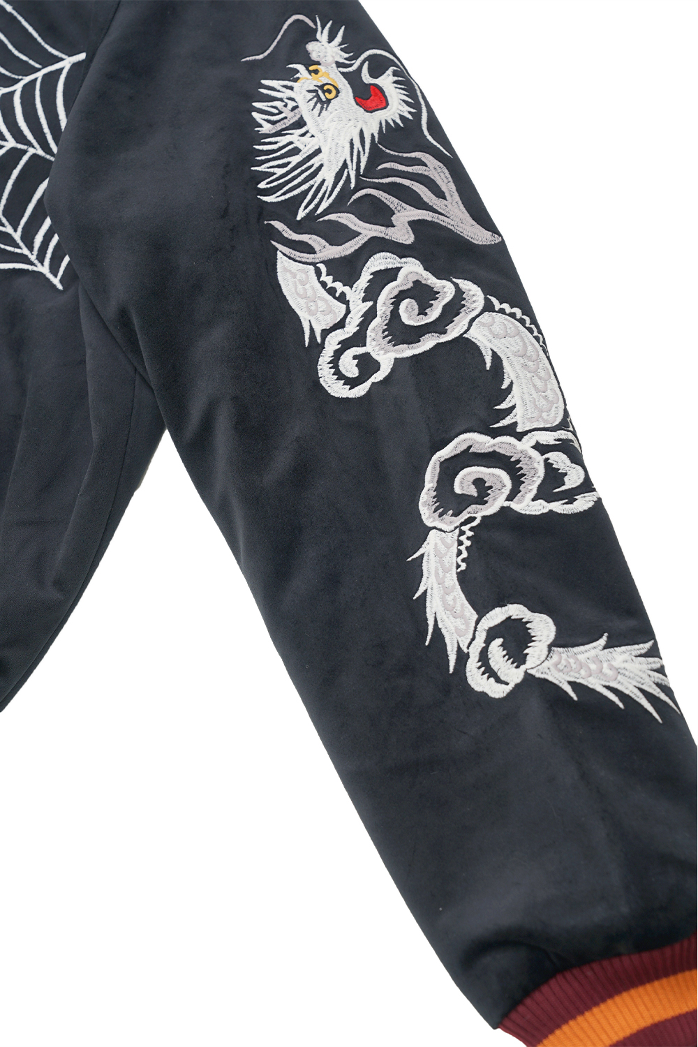 Houston Japan 51387 Velvetten Souvenir Jacket (Skull) - Black 휴스턴의 스카잔 시리즈에서 보기 드문 디자인 중 하나인 스컬문양 자수 디자인입니다. 벨벳 원단을 사용했고 가슴,소매,뒷면에 자수가 놓여져 있습니다. 착용시 XL 사이즈가 일반적인 100 사이즈, XXL 사이즈가 105 사이즈 정도입니다.