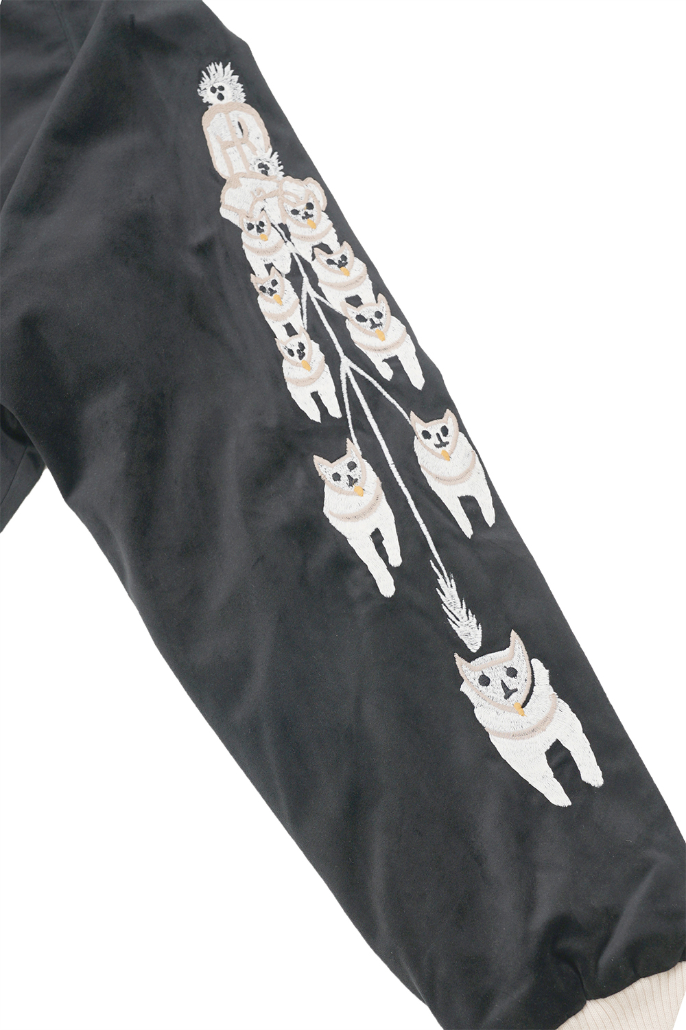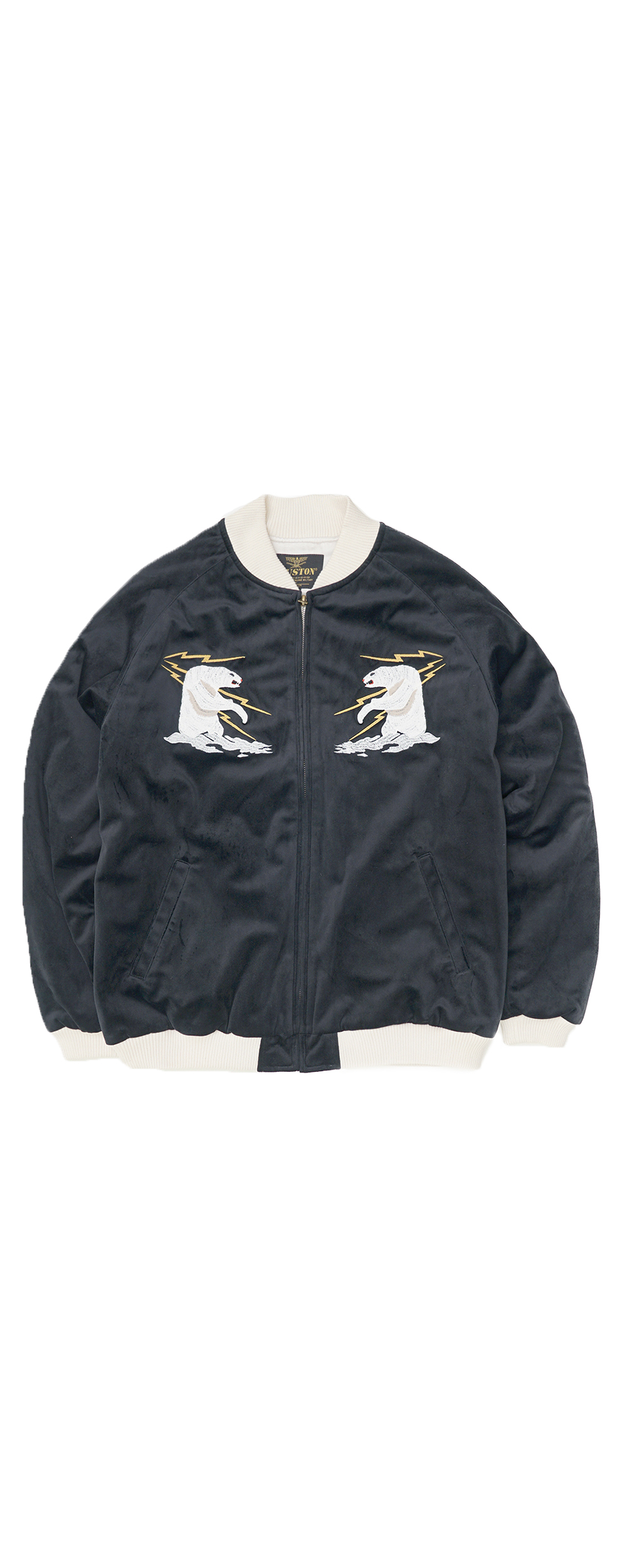 수베니어 자켓입니다. 특유의 부드러운 감촉과 광택감이 특징입니다. 자수가 특징인 아이템으로 프론트의 양쪽의 알래스카 곰의 자수와, 양 소맷단의 썰매개 자수 그리고 후면부의 큼지막한 사이즈의 알래스카 곰의 자수가 디자인 되어 있습니다. 착용시 XL 사이즈가 일반적인 100 사이즈, XXL 사이즈가 105 사이즈 정도입니다.