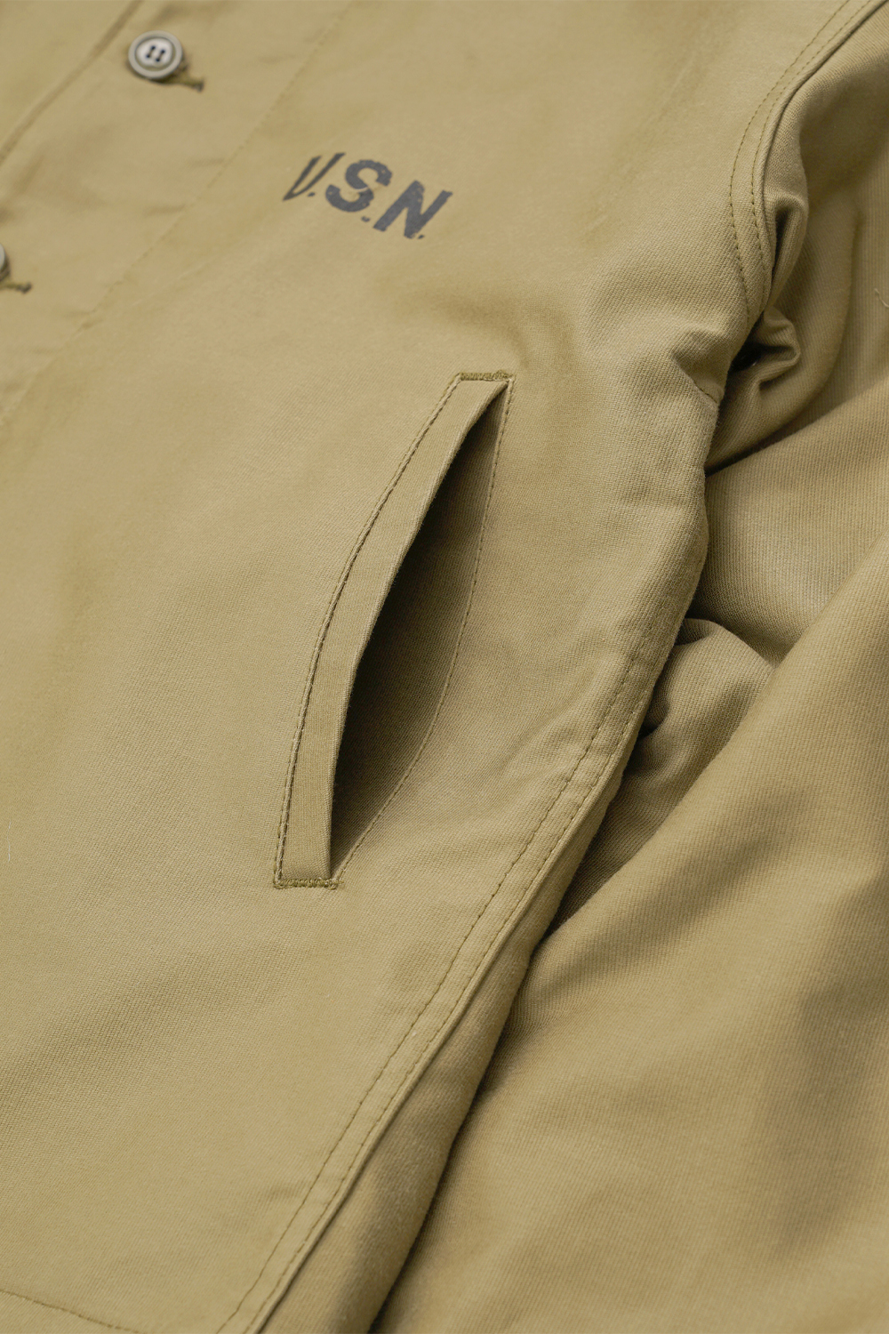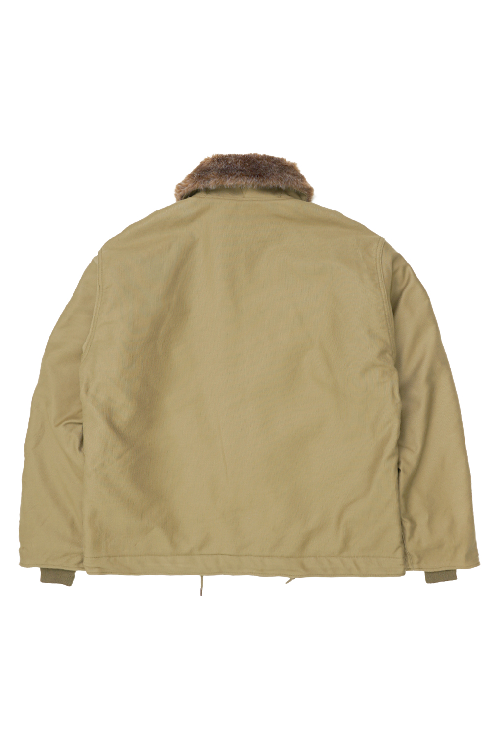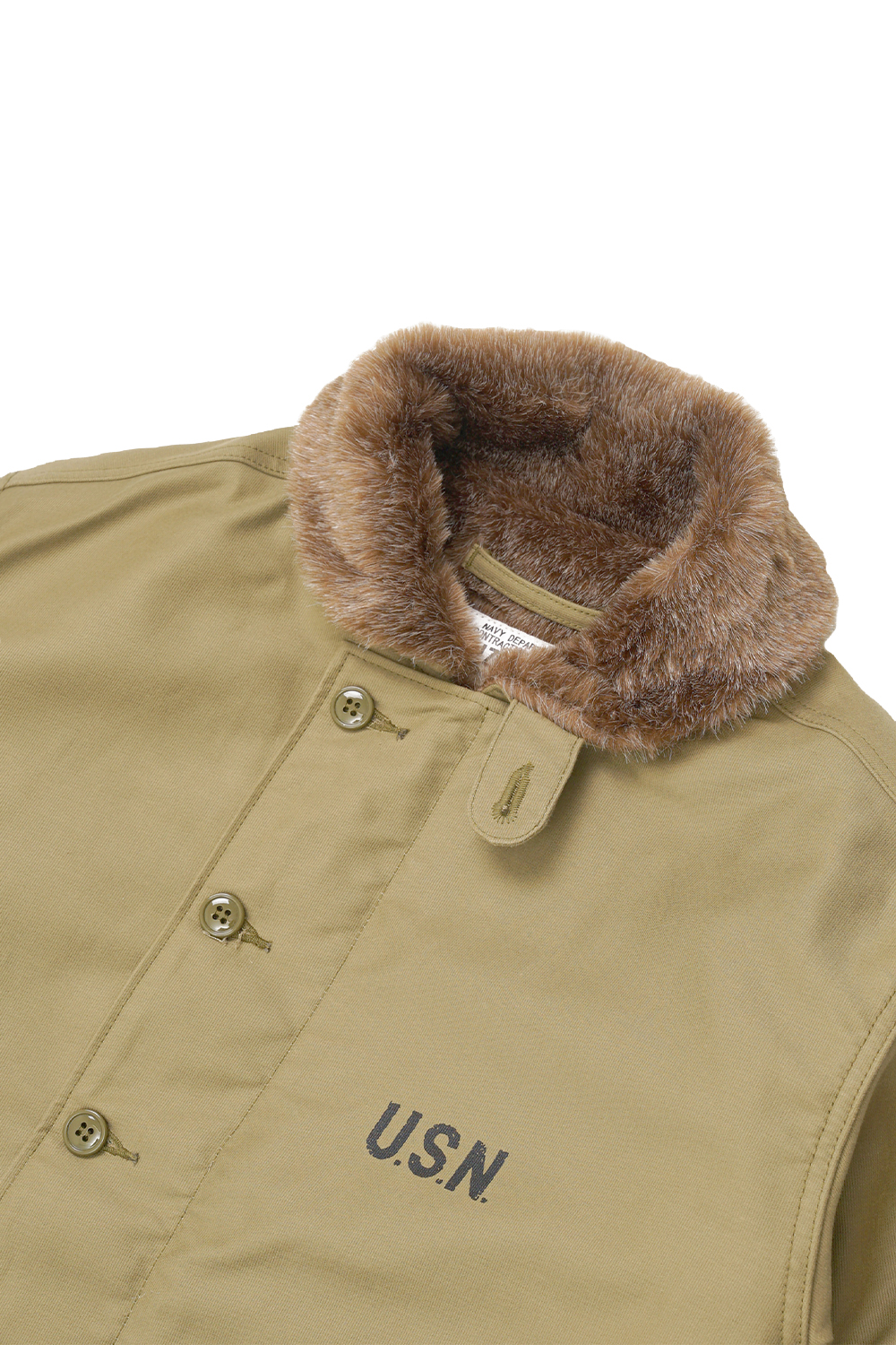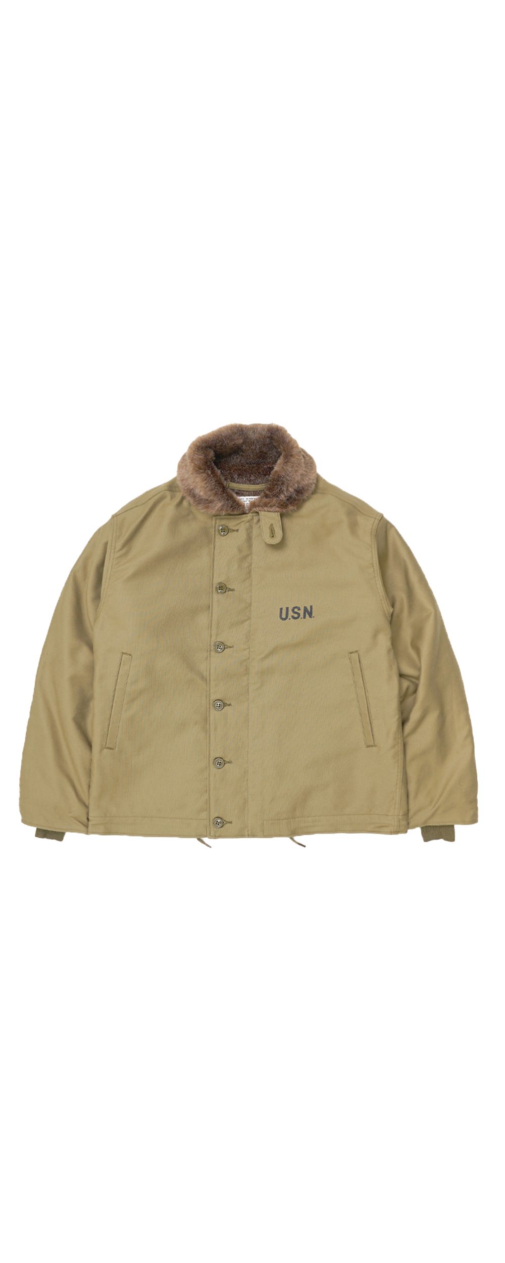 두껍고 튼튼한 헤비 피케원단으로 제작된 덱자켓입니다. 안쪽 전면에 보아털이 붙어 있어 높은 보온성을 가지고 있습니다. 목부분은 N-1의 상징이기도한 보아털 카라이며, 카라 뒷면에 달린 버튼식 친스트랩으로 고정하면 보아가 목을 감싸 더 높은 보온을 유지할 수 있습니다. 전면은 IDEAL사(社)의 지퍼 위에 두껍고 튼튼한 플랩이 배치된 플라이프런트 형식입니다. 소매는 튜브리브 형식이며 겨드랑이 부분에는 환풍을 위한 4개의 벤틸레이션이 있고 안감에는 땀에 의한 손상을 방지하기 위해 별도의 천이 덧대어 있습니다. 왼쪽 가슴에는 USN 스텐실이 있고 손을 넣기 쉽도록 사선의 슬러시 포켓이 배치되었습니다. 밑단 부분에는 품을 조절할 수 있는 끈이 있습니다. 착용시 42 사이즈가 105 사이즈 정도입니다.