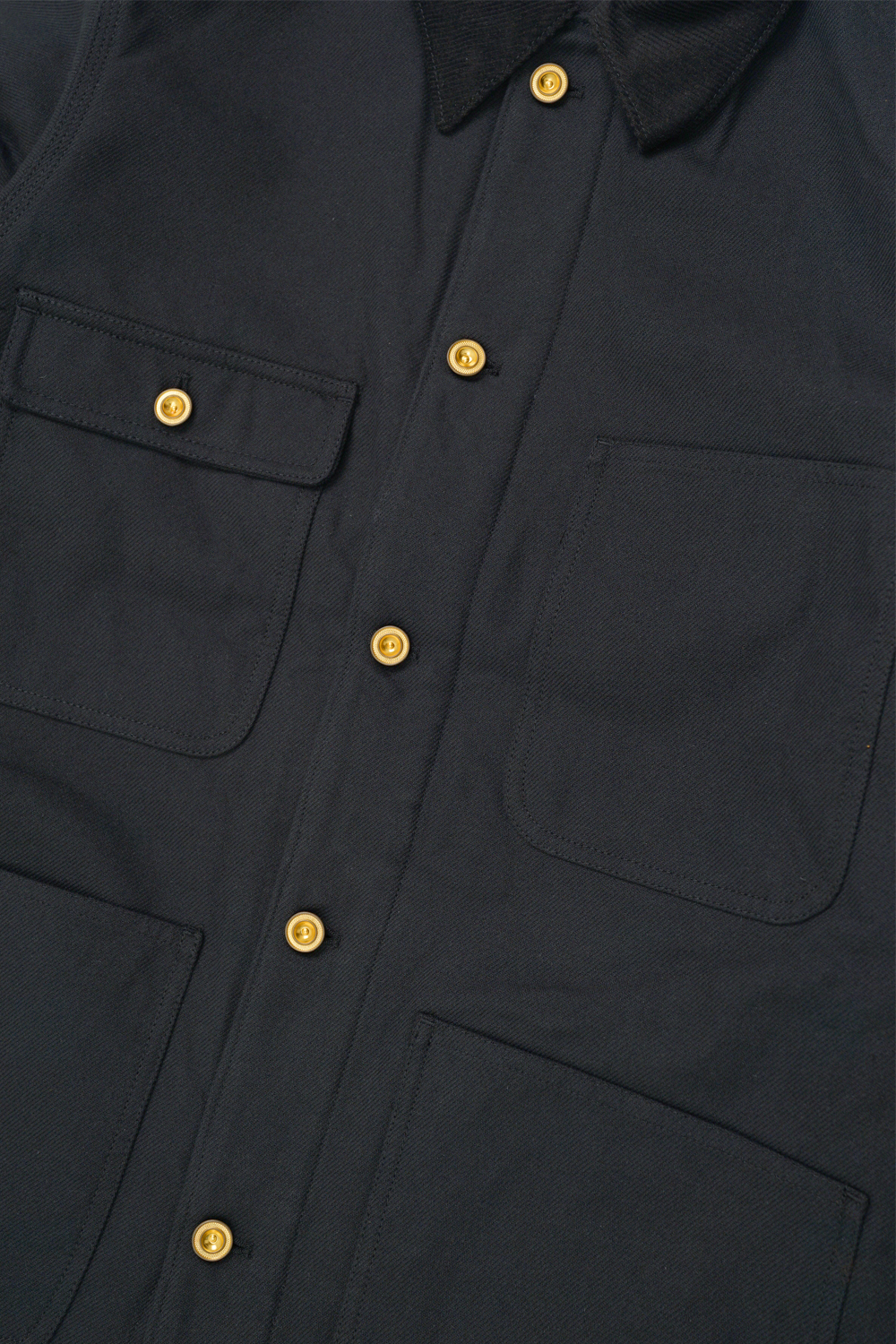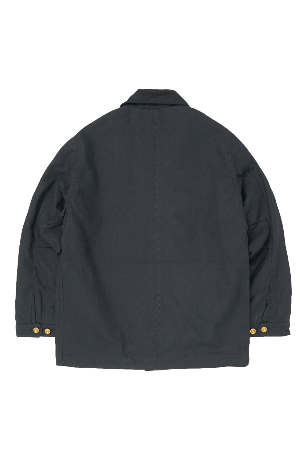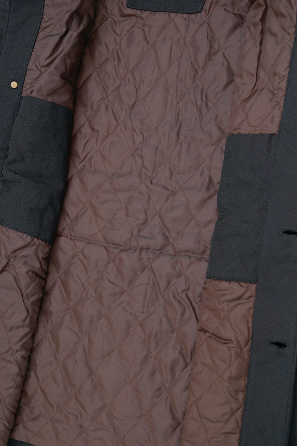 비예라 원단(양모와 면을 혼방한 소재)으로 제작한 커버올입니다. 일반적인 덕캔버스 소재의 워크웨어 계열 커버올은 원단이 딱딱해서 착용하기 불편한 것이 문제점이지만, 이 아이템은 원단이 부드러워 스트레스없이 착용 가능합니다. 코듀로이의 카라와 빈티지 느낌의 턱 버튼으로 아메카지 아이템과의 궁합도 뛰어난 아이템. 안감에는 퀼팅이 적용돼 보온성도 뛰어납니다. 착용시 XL 사이즈가 저스트한 105 사이즈 정도입니다.