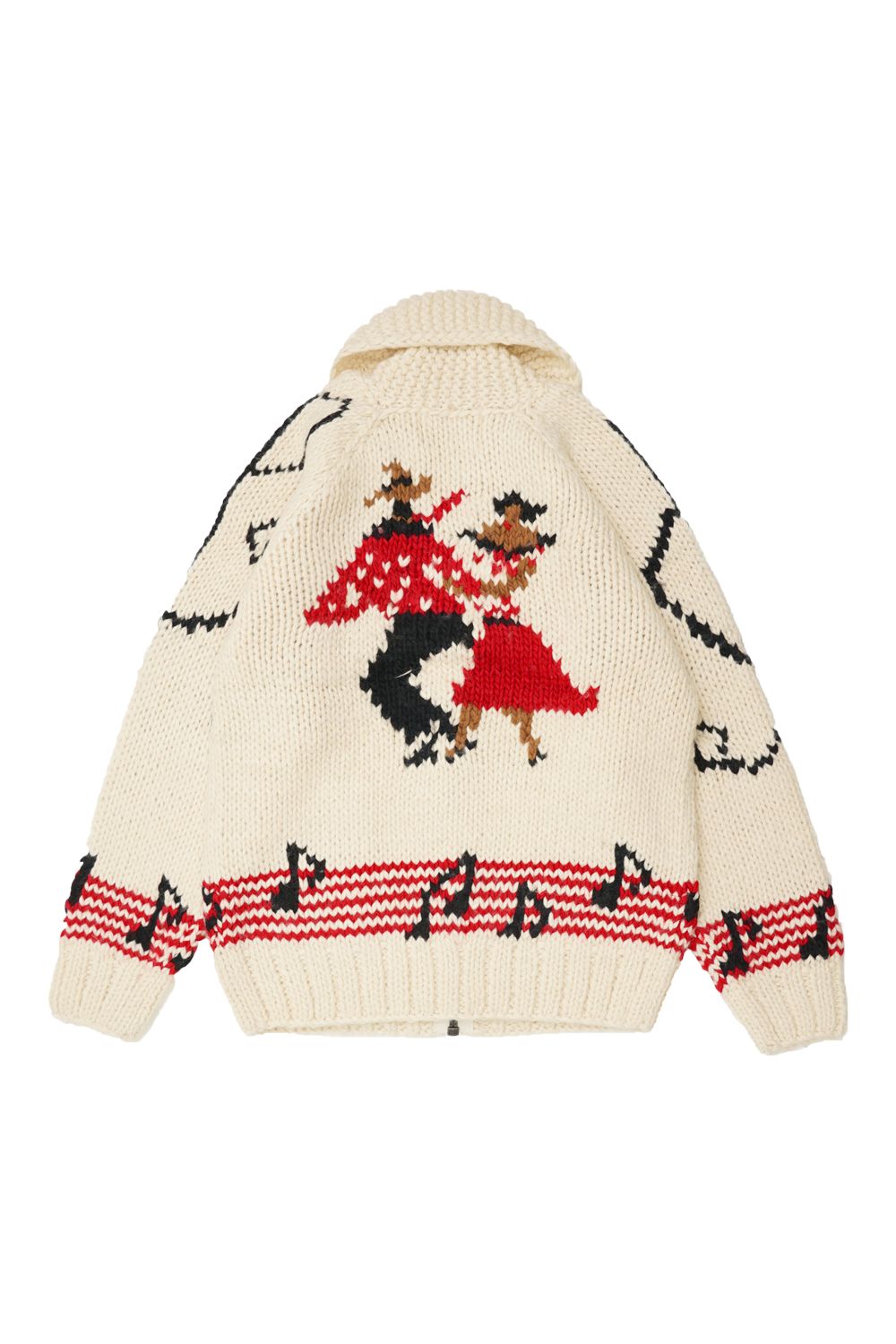 손뜨개질로 제작된 코위찬 스웨터입니다. 기계 뜨개질과는 차원이 다른 매무새와 착용감을 느낄 수 있습니다. 등판에는 레어한 댄스무늬가 디자인 되었습니다.