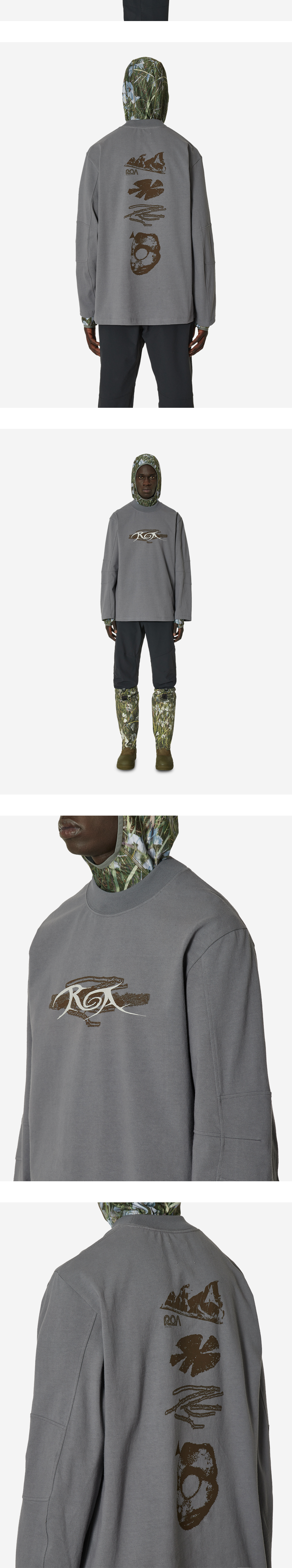 아웃도어를 연상시키는 프린팅과 패널 디테일이 매력적인 로아의 롱 슬리브입니다. - 헤비웨이트 코튼 소재 - 전/후면 로고 프린팅 - 팔꿈치에 적용된 패널 디테일 - 높이감 있는 립의 넥라인