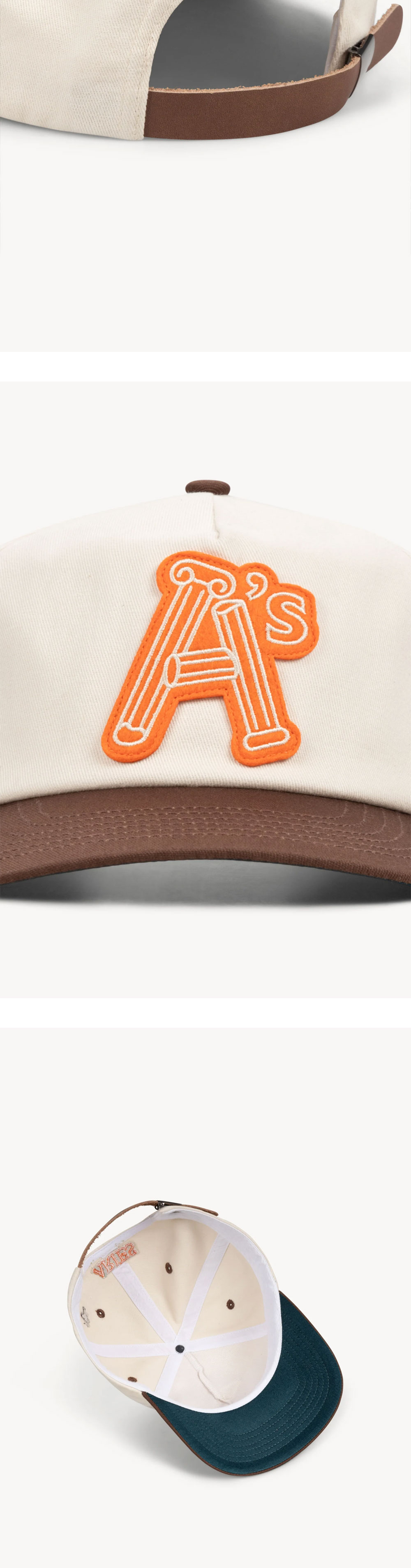 에리즈 얼라이즈의 코튼 로고 볼캡입니다. - 전면 A's 로고 패치 디테일 - 가죽 소재 후면 스트랩으로 사이즈 조정 가능