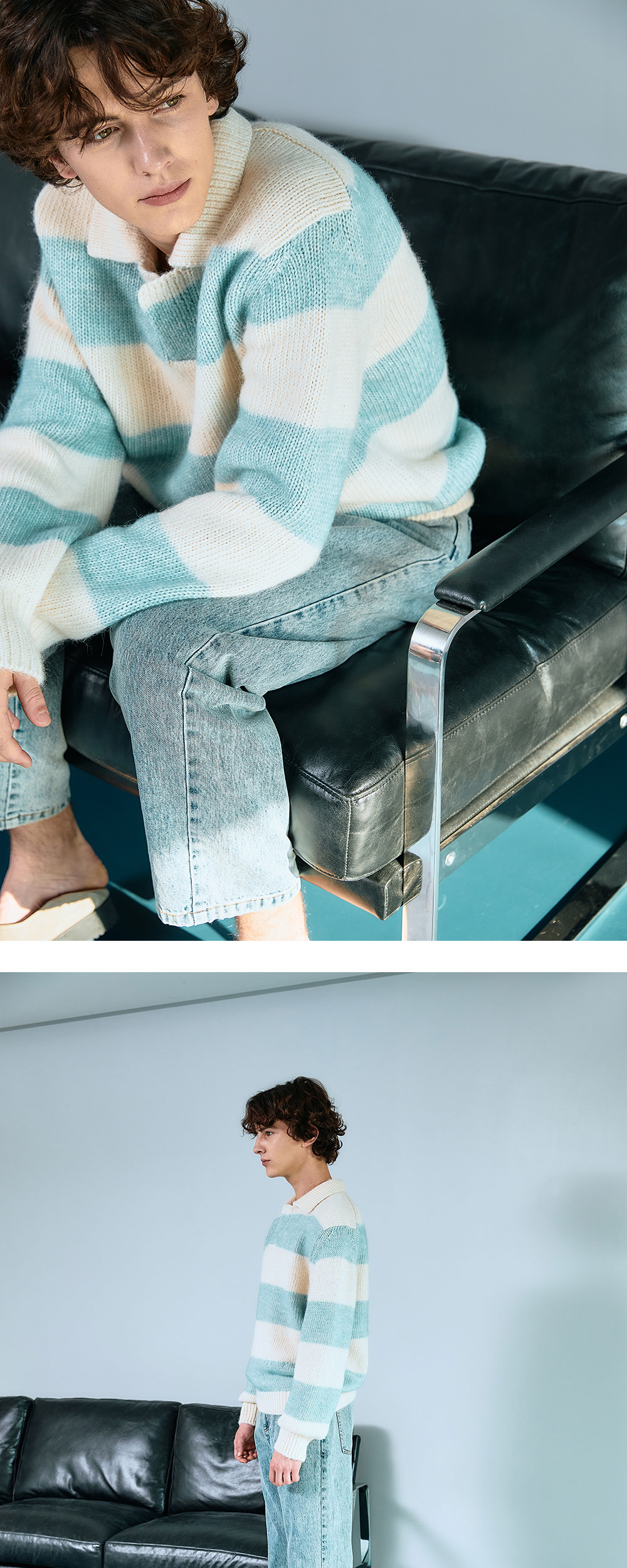 바이랑 스트라이프 코튼 알파카 폴로 스웨터 민트