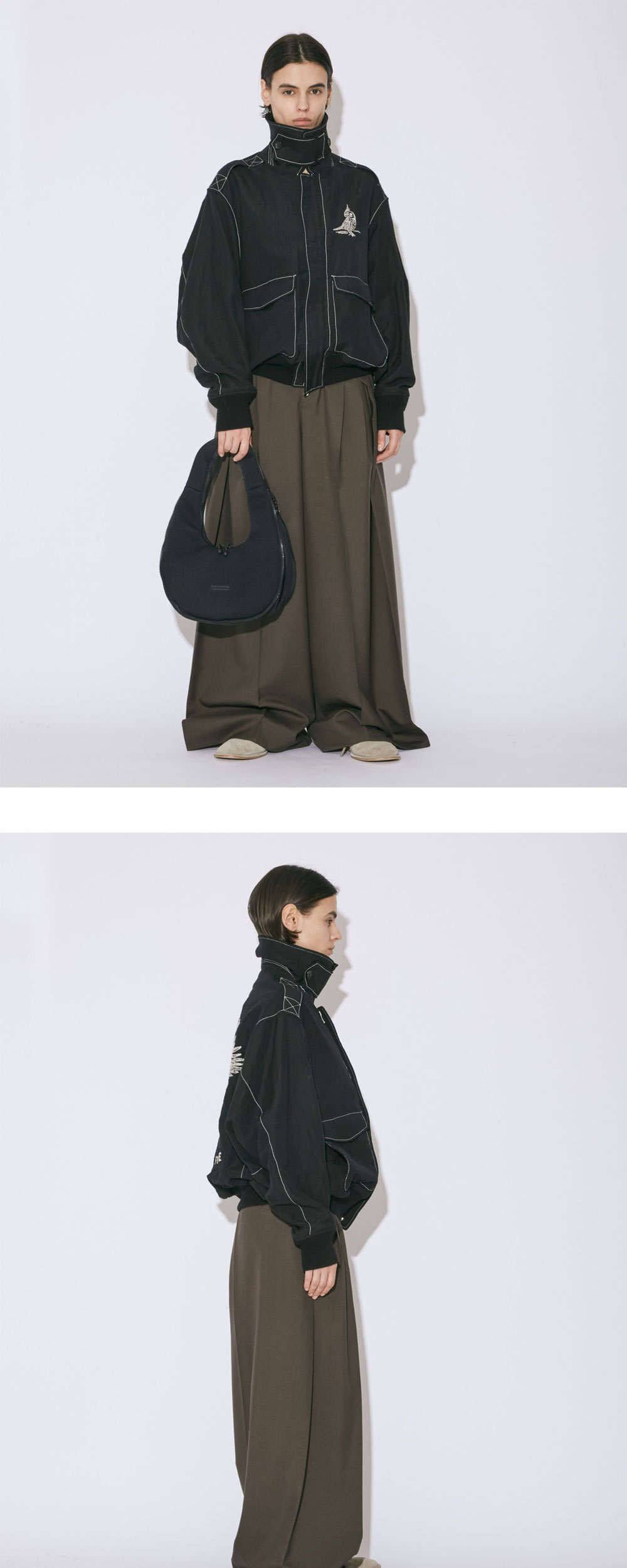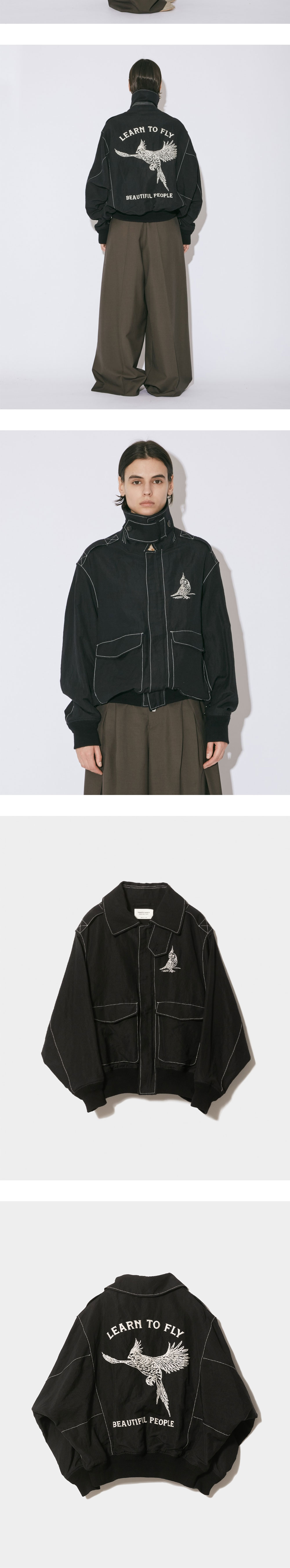 화이트 배색의 스티칭 디테일이 특징인 뷰티풀 피플의 울 린넨 웨더 클로스 A-2 자켓입니다. - 비죠 장식으로 하이넥 연출 가능 - 후면의 자수 아트워크