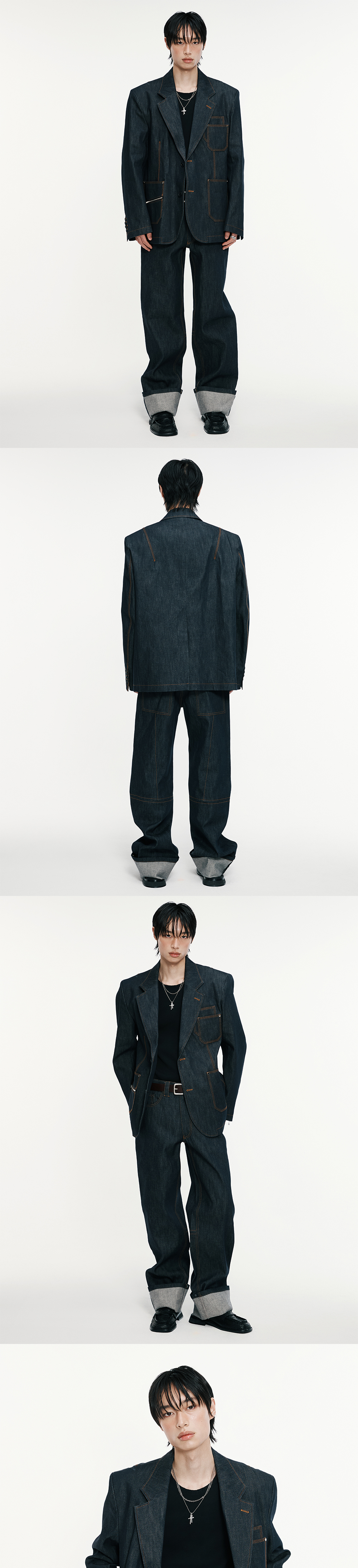 데님 소재로 제작된 세미-오버사이즈 실루엣의 블레이저입니다. 생지 데님에 옐로우 스티치를 사용하여 캐주얼한 분위기를 연출하였으며, 패치포켓 및 리벳 디테일을 통하여 워크웨어적인 요소를 담아내 유니크함을 더했습니다. 테일러드 공정을 통해 생산되어 블레이저 특유의 탄탄한 실루엣을 연출합니다. -DETAIL- 세미-오버사이즈 실루엣 트리플 스티치 등판 다트 절개 가슴 이중 패치포켓 지퍼 디테일 패치포켓 소매 리얼 버튼 및 천연 소뿔 단추 사용 -model- 184cm / 가슴둘레 83cm / 허리둘레 70cm / 엉덩이둘레 90cm - 2사이즈 착용