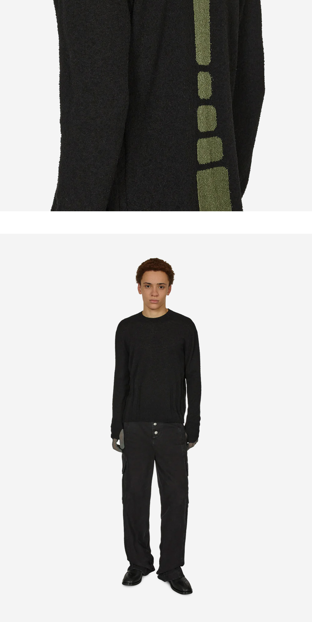 뒷면의 독특한 그래픽 패널에서 속도감을 느낄 수 있는 _J.L-A.L_의 에어 니트입니다. - 청키한 느낌의 니트 - 타월 원단 - 후면 그래픽 패널 디테일 - 소매 썸홀 디테일