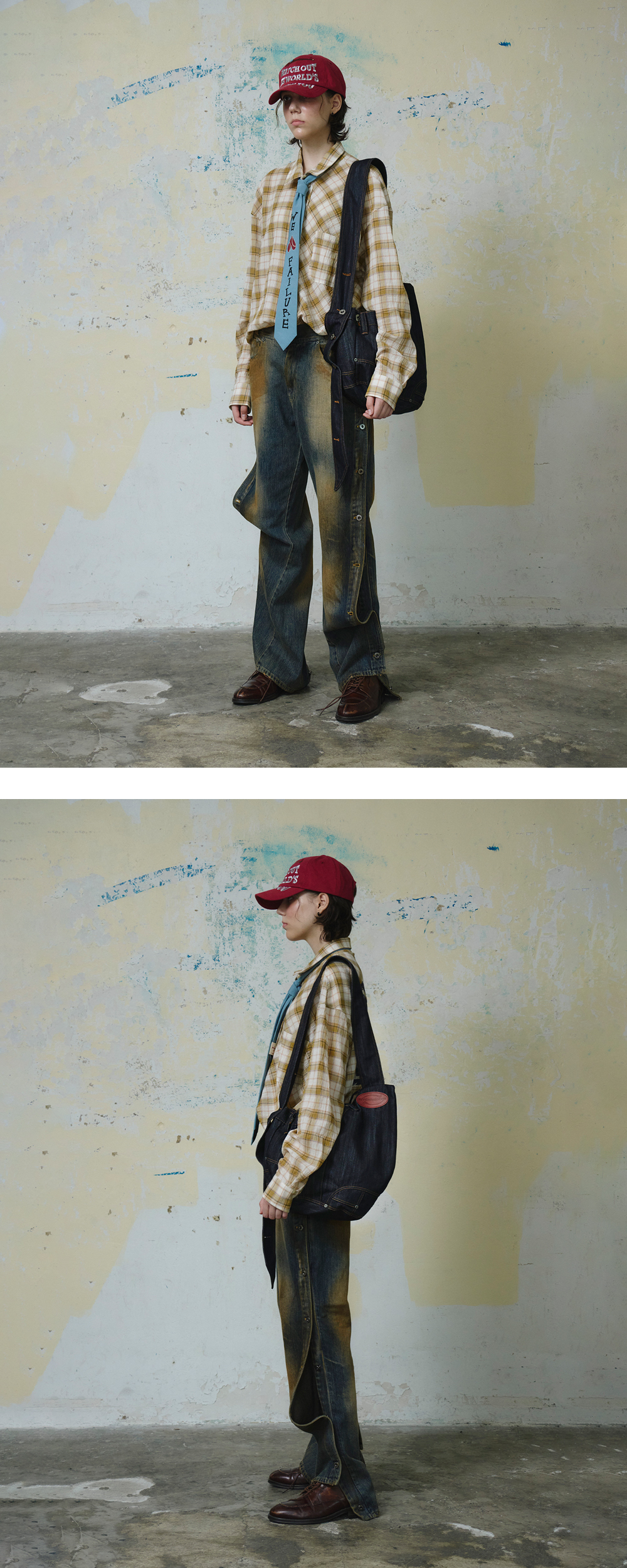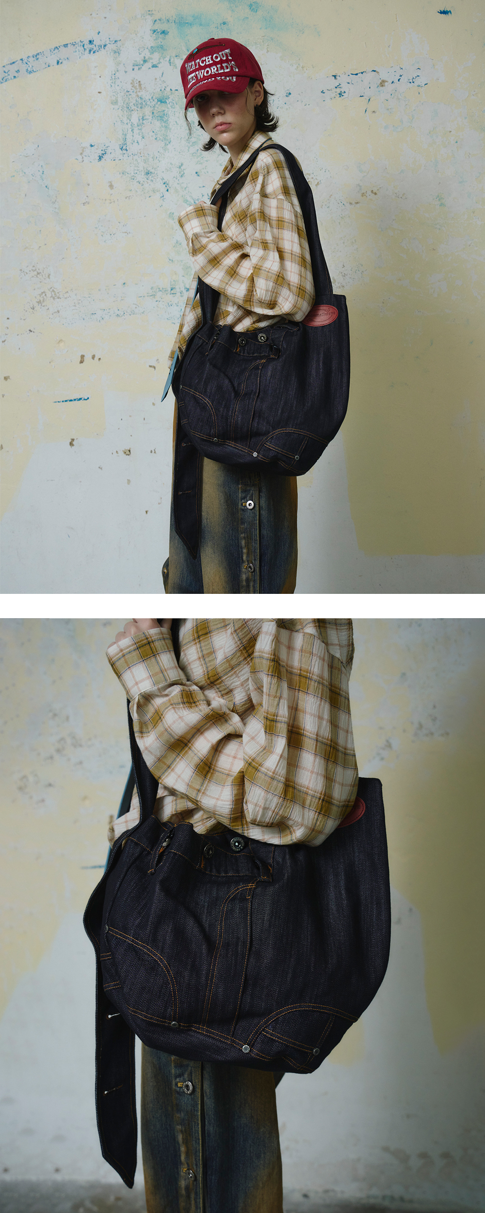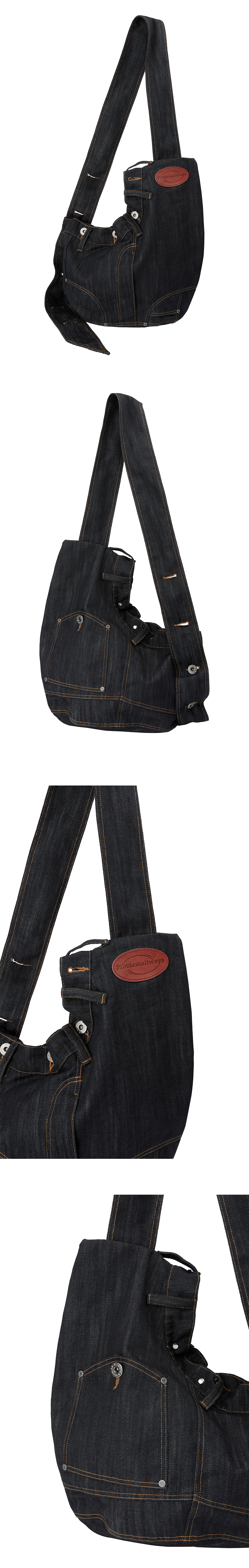 Cotton 100% 데님 팬츠 디자인을 응용한 데님 크로스바디 백 윗부분 비대칭 켄톤 위치를 통한 주름 형성 전면부 레더 패치 켄톤을 이용한 가방 끈 길이 조절 로고 켄톤 디테일 *Model: 175cm / Bust: 32 Waist: 24 Hips: 34.5 (inch)