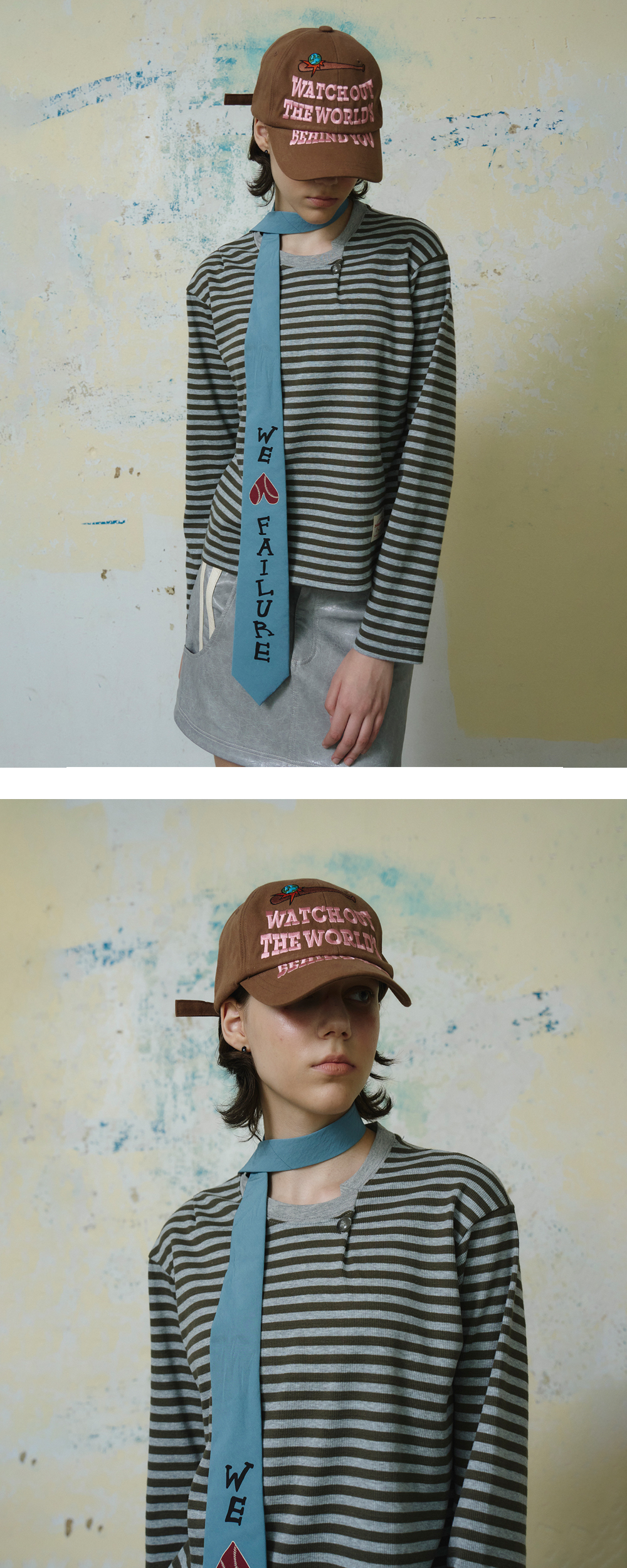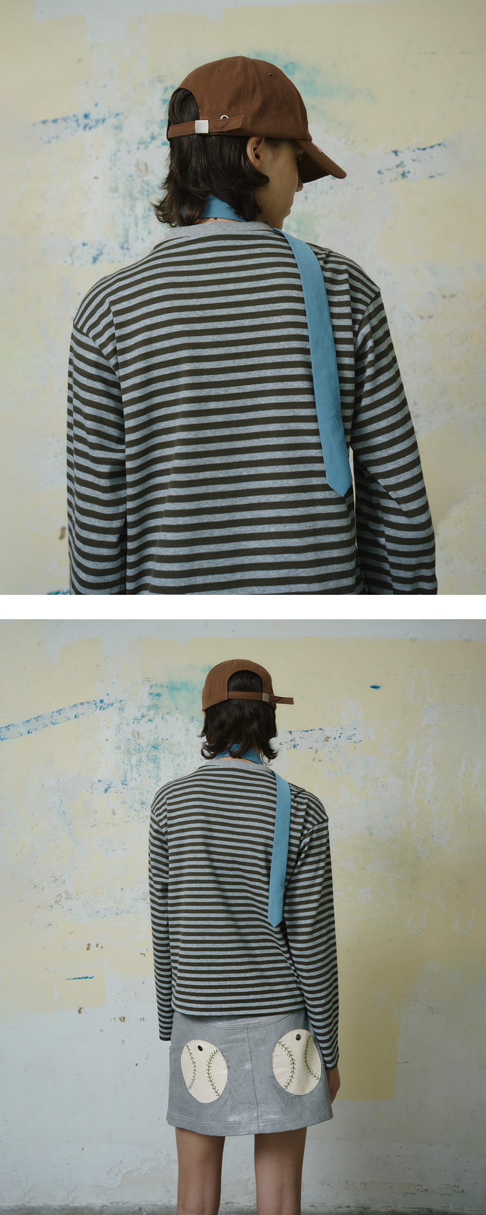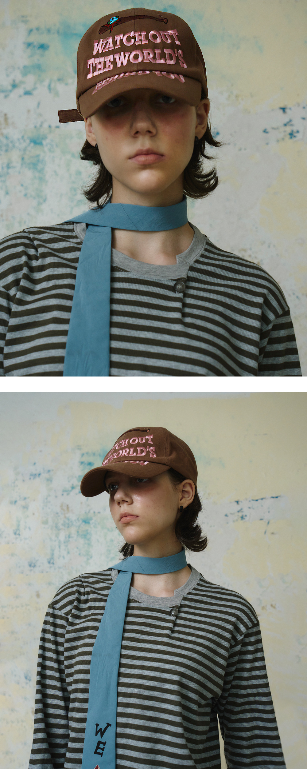Cotton 100% 둘레가 넓고 깊은 핏 전면부 사틴 자수 사이즈 조절 버클 *Model: 175cm / Bust: 32 Waist: 24 Hips: 34.5 (inch)