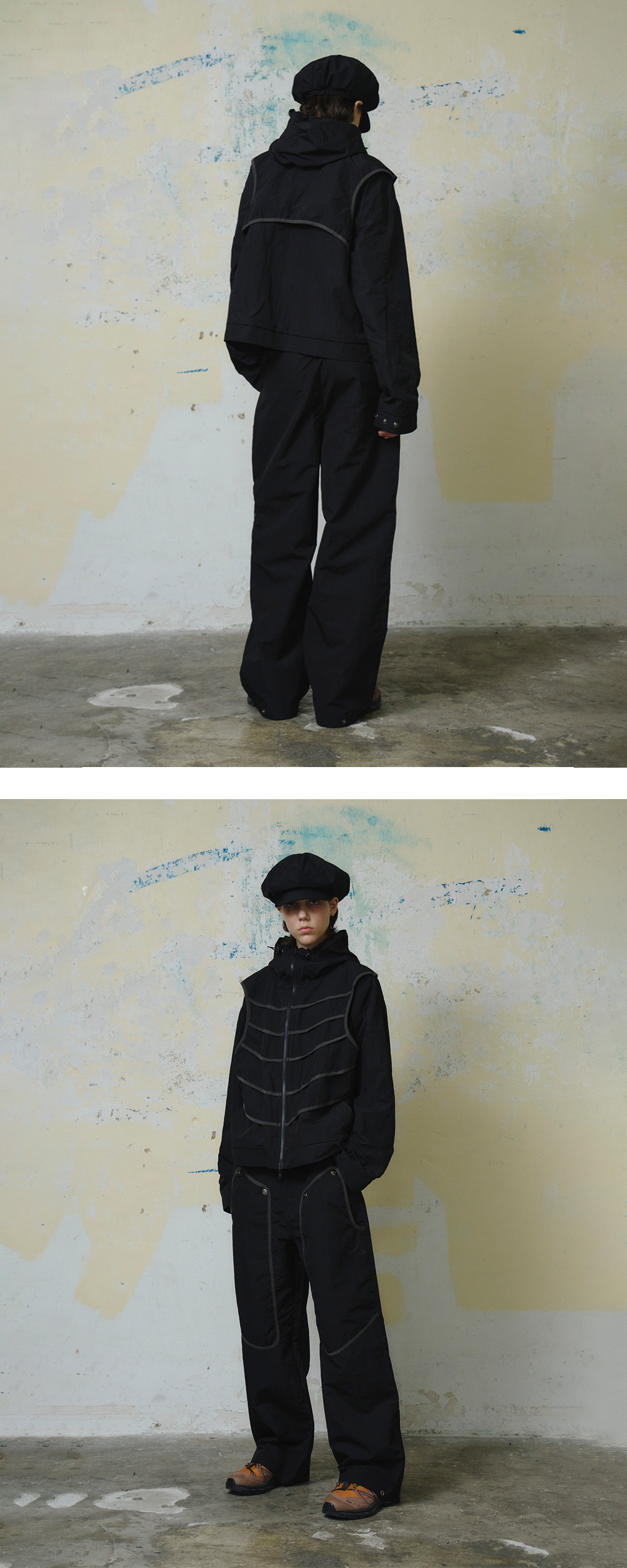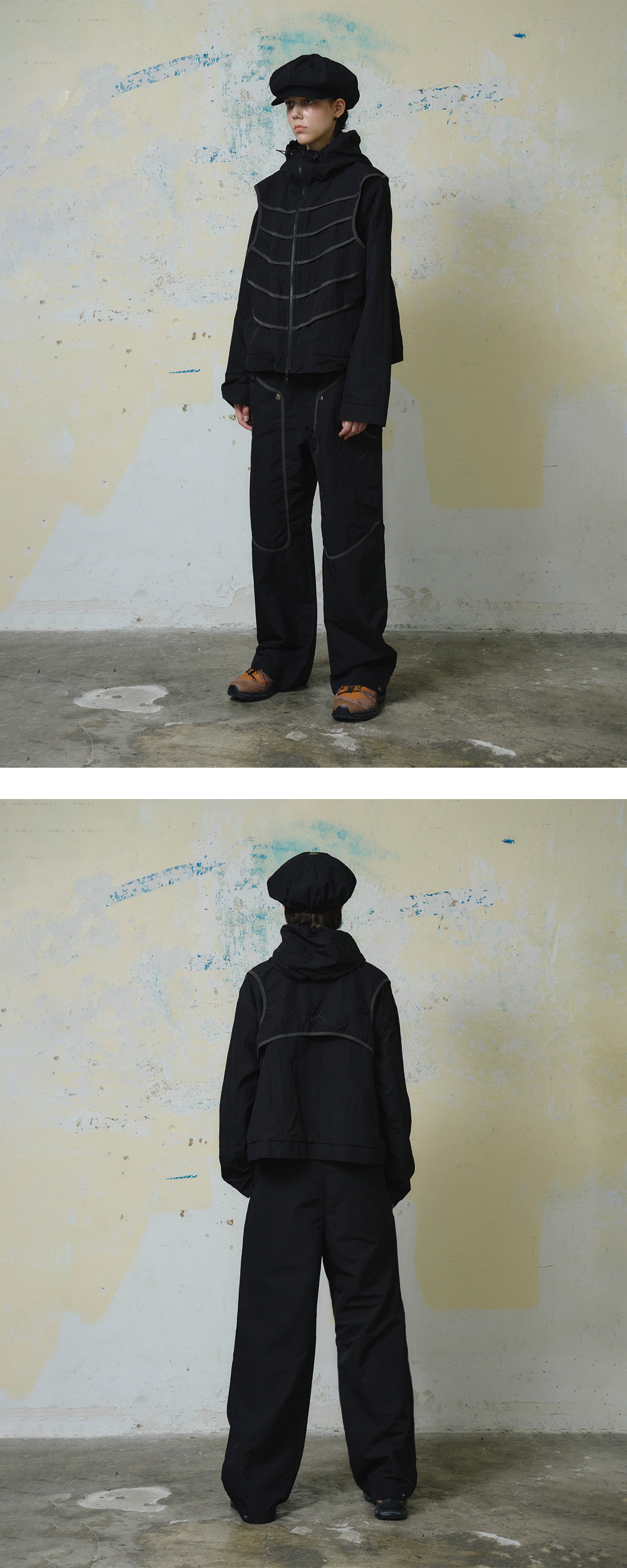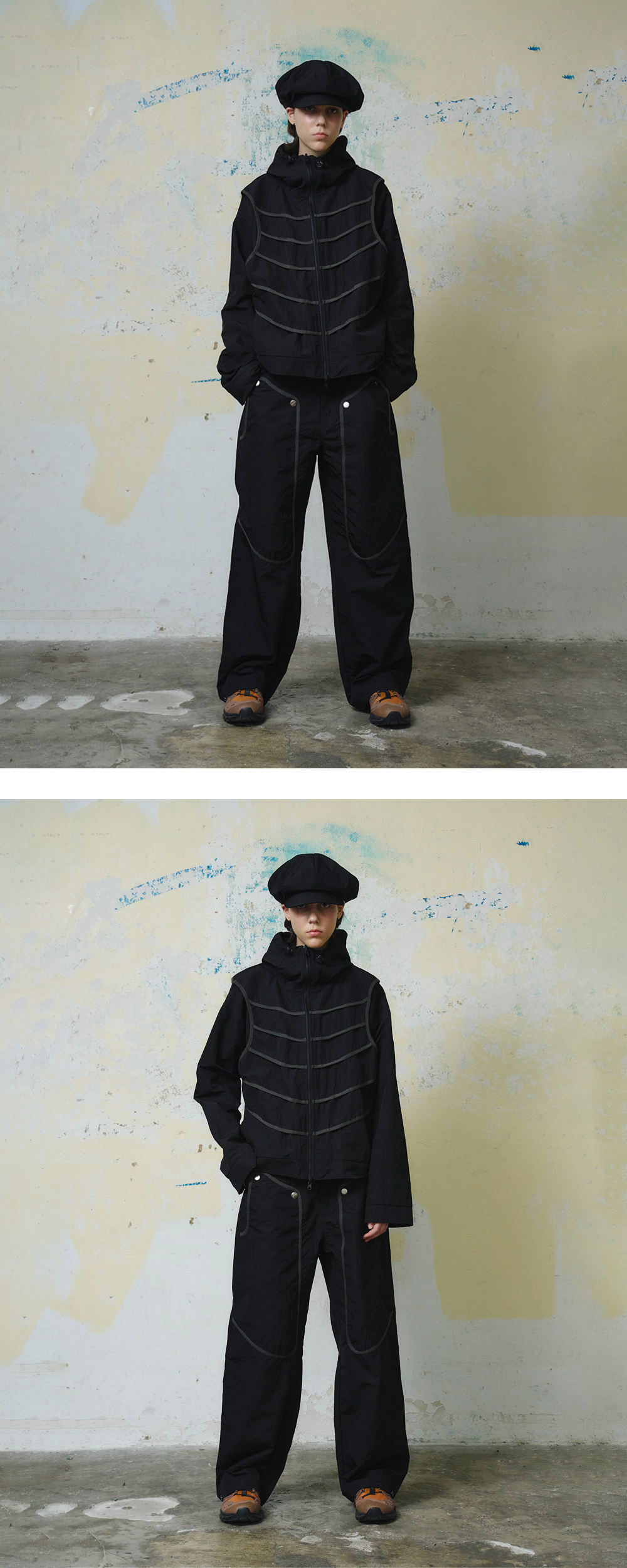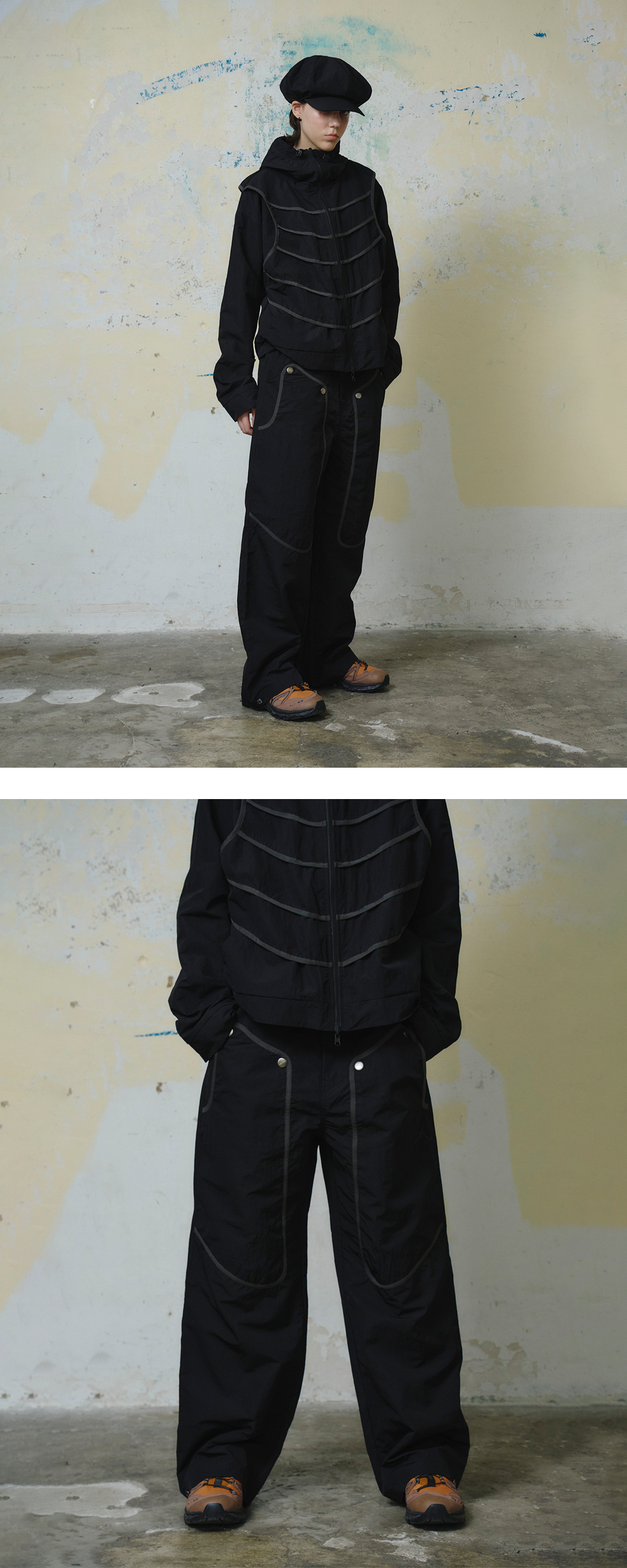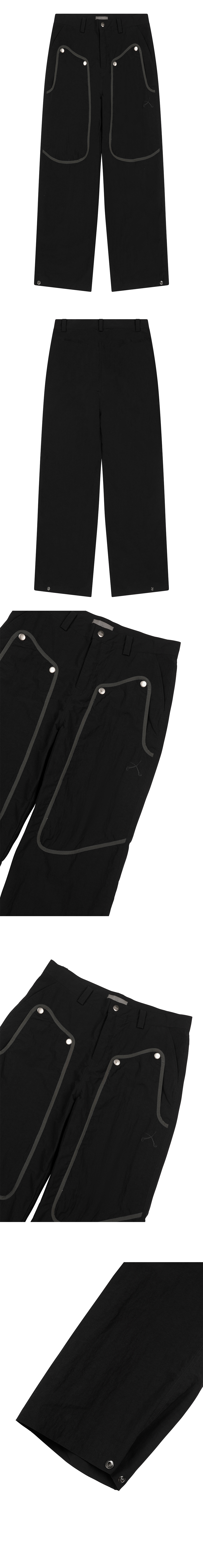 Nylon 60%+Polyester 40% 포수의 보호구에 영감을 받은 더블 니 나일론 팬츠 전면부 접밴드 디테일 로고 스냅 디테일 왼쪽 포켓 부분 로고 핸들 나염 밑단 스냅을 이용한 실루엣 조절 *Model: 175cm / Bust: 32 Waist: 24 Hips: 34.5 (inch) / Size: Leaf