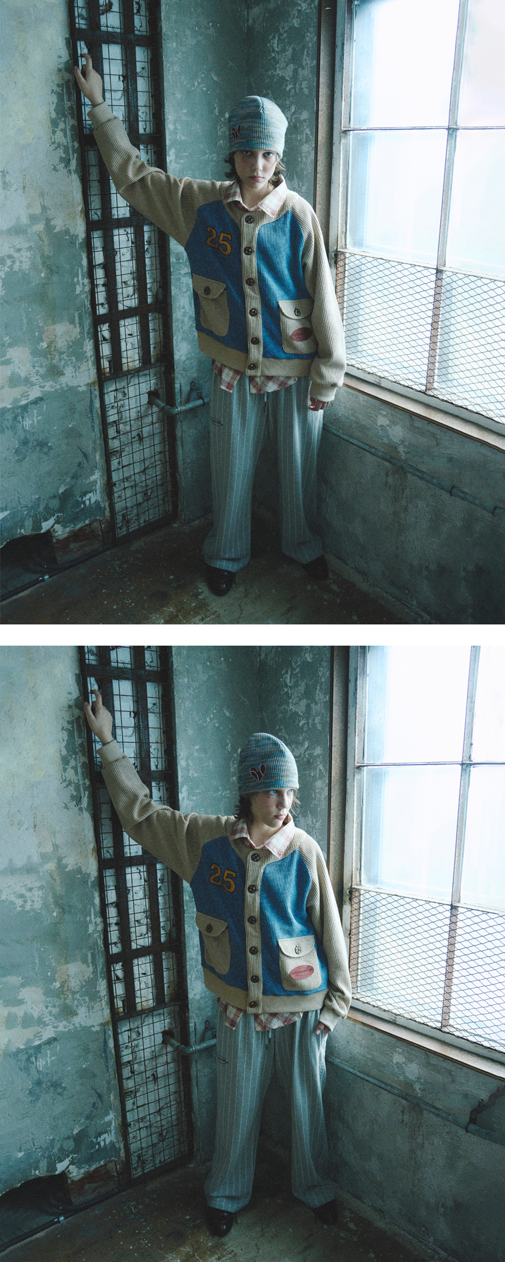 Cotton 75%+Polyester 25% 야구 유니폼에 영감을 받은 세미 오버핏 래글런 니트 가디건 앞뒤판 크랙 나염 앞판 왼쪽 포켓 레더 패치 체크 단추 디테일 *Model: 175cm / Bust: 32 Waist: 24 Hips: 34.5 (inch)