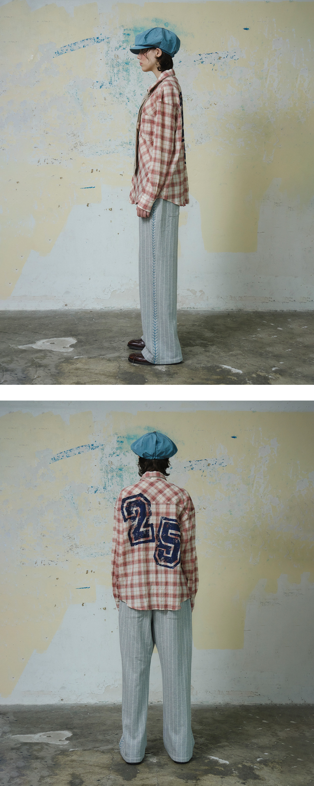 Cotton 100% 오버사이즈 핏 체크 셔츠 중량감이 적고 두께감이 얇은 원단 뒤판 등번호 25 크랙 나염 *Model: 175cm / Bust: 32 Waist: 24 Hips: 34.5 (inch)